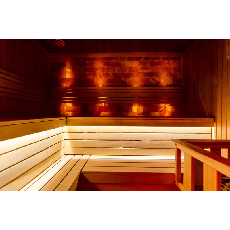 Om niet alleen het lichaam maar ook de ogen te laten genieten, werd een muur van gladde Himalayazoutstenen geïnstalleerd, verlicht door kroonluchters die onder de rugleuning waren gemonteerd.