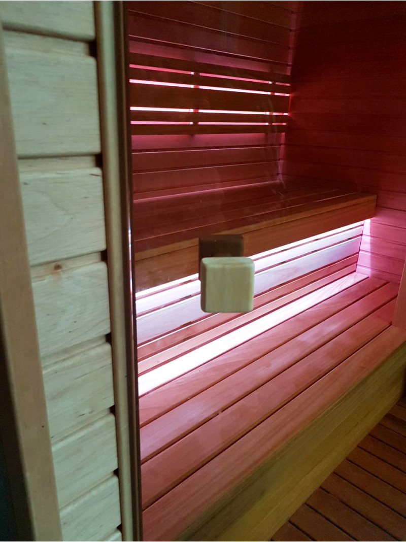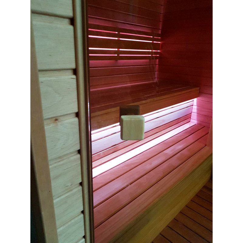 Saunaverlichting is een heel belangrijk detail dat een half ontspannend effect geeft in de sauna. Onder de banken en rugleuningen zit LED RGB-kleurverlichting, deze kun je op elk moment van kleur veranderen. De sauna is tevens voorzien van een glasvezel wit verlichtingssysteem "Moon".