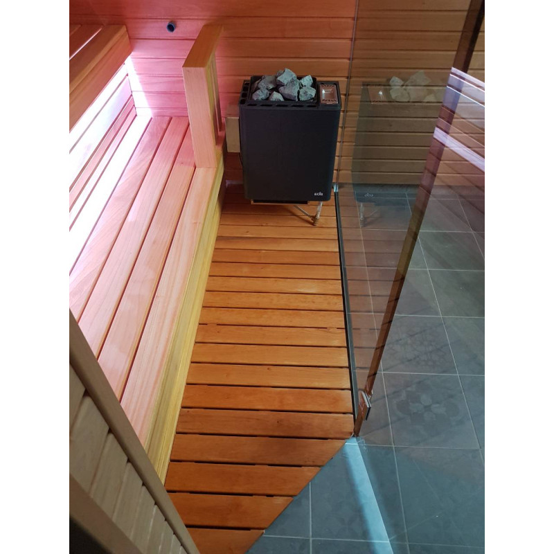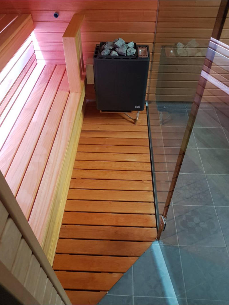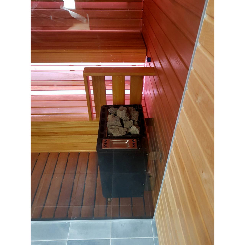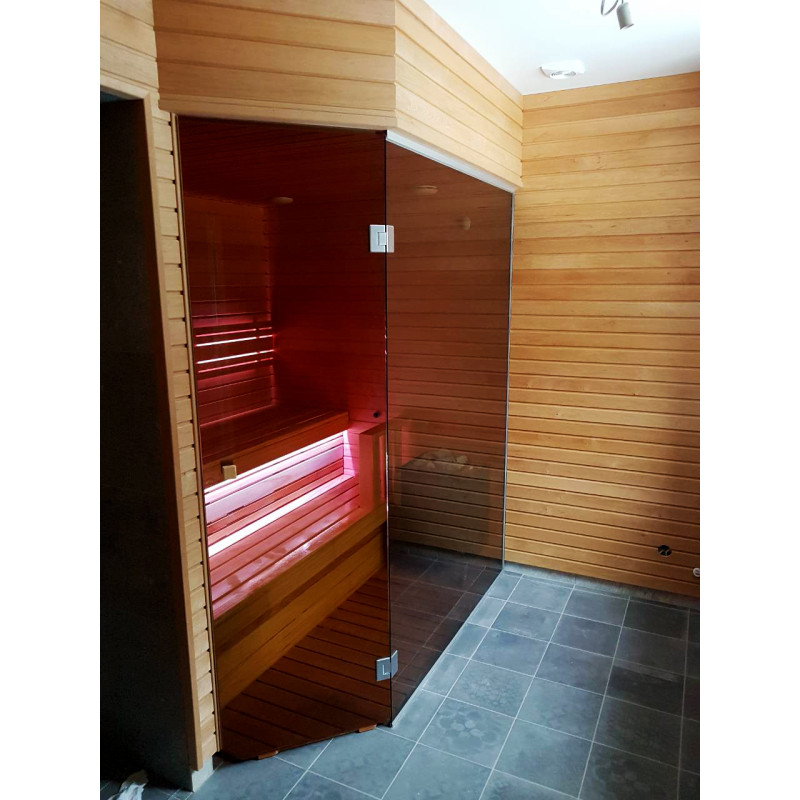 In plaats van traditionele deuren en wanden heeft deze combisauna een modern ogende vitrine van gehard getint glas. Zo'n vitrine is modern en geeft een gevoel van ruimte.