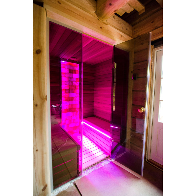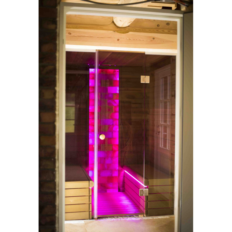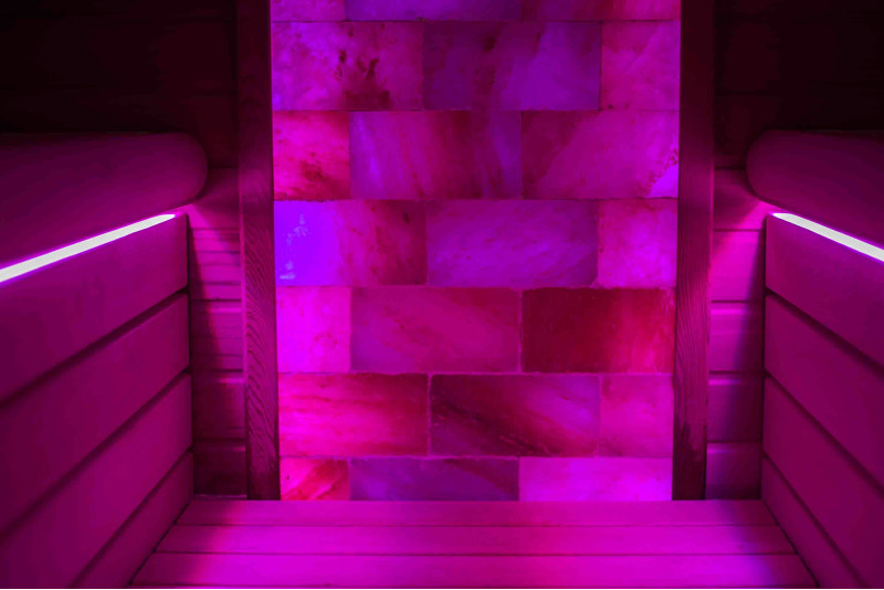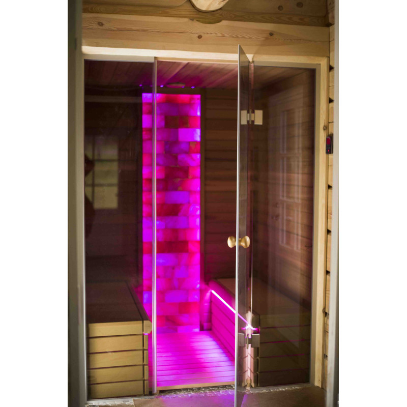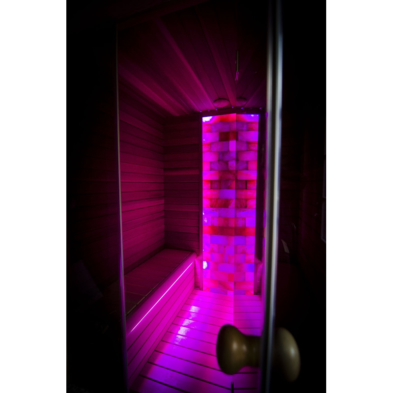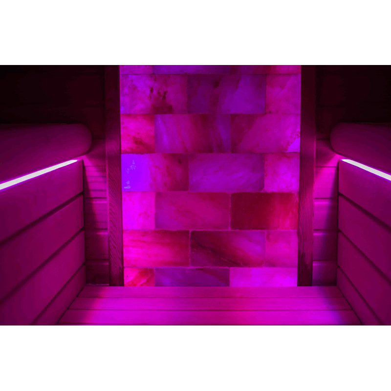 De Himalaya zoutstenen muur die is gekozen voor de decoratie van de sauna met de ingebouwde gekleurde RGB-verlichting, aangestuurd door een draadloze kleurwisselaar, creëert een gezellige omgeving en versterkt het effect van de sauna nog meer.