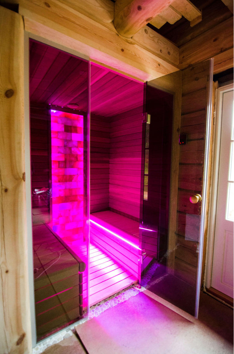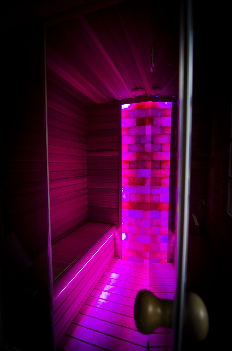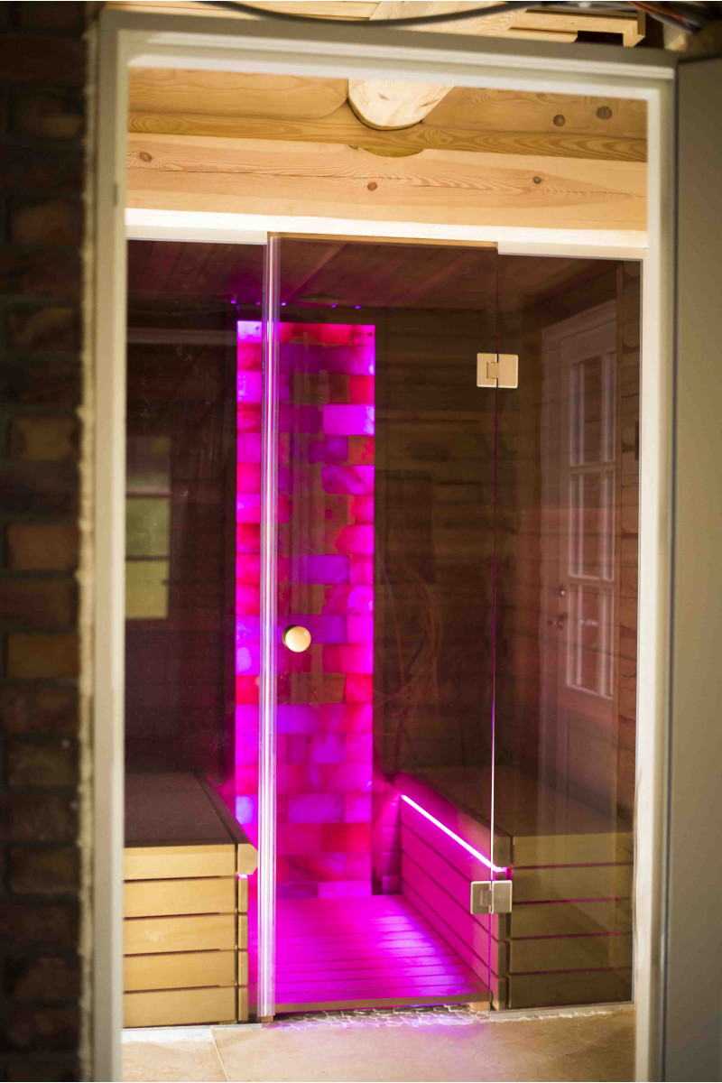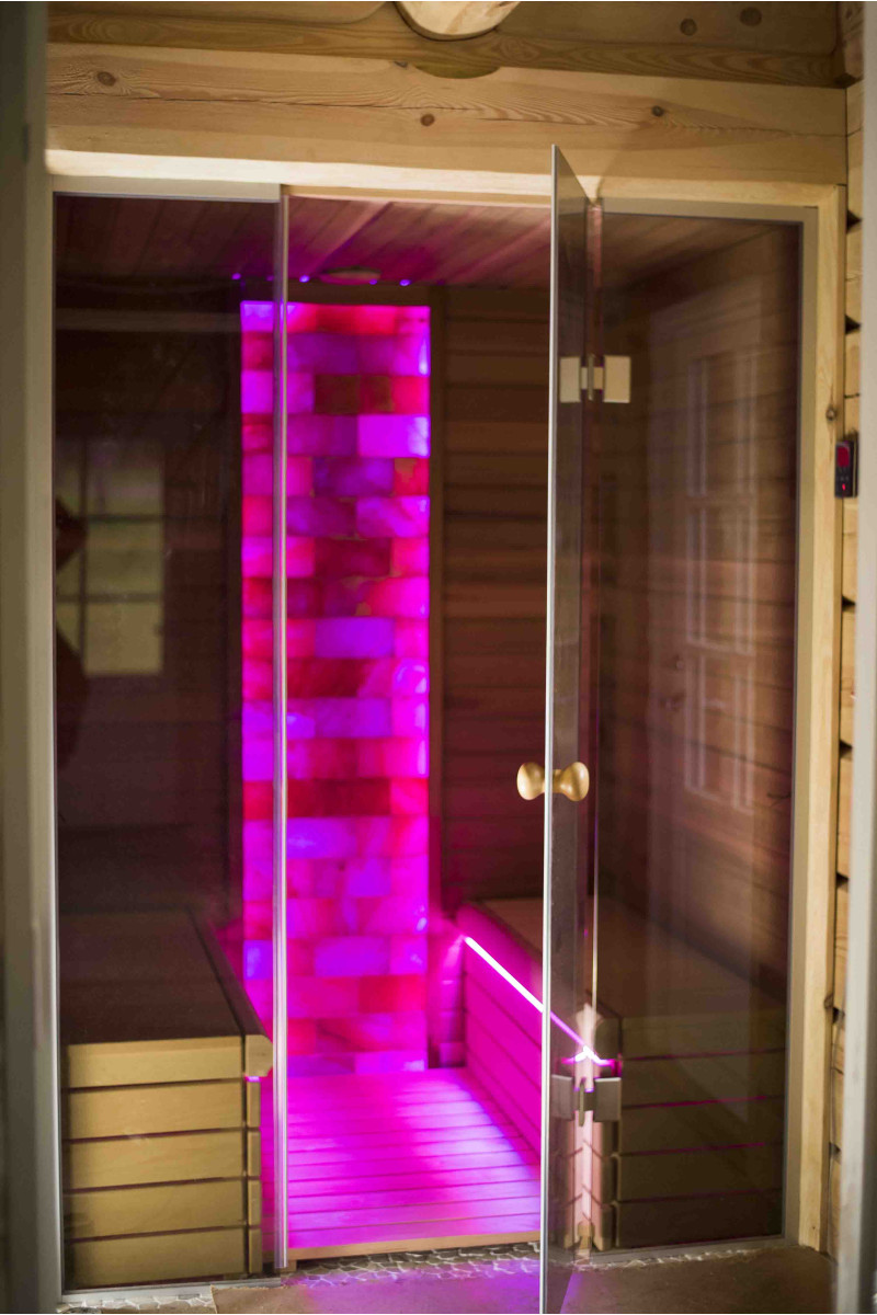De Himalaya zoutstenen muur die is gekozen voor de decoratie van de sauna met de ingebouwde gekleurde RGB-verlichting, aangestuurd door een draadloze kleurwisselaar, creëert een gezellige omgeving en versterkt het effect van de sauna nog meer.