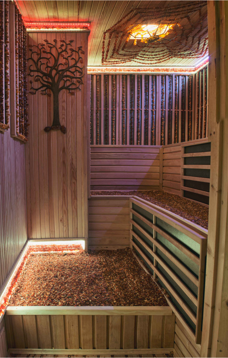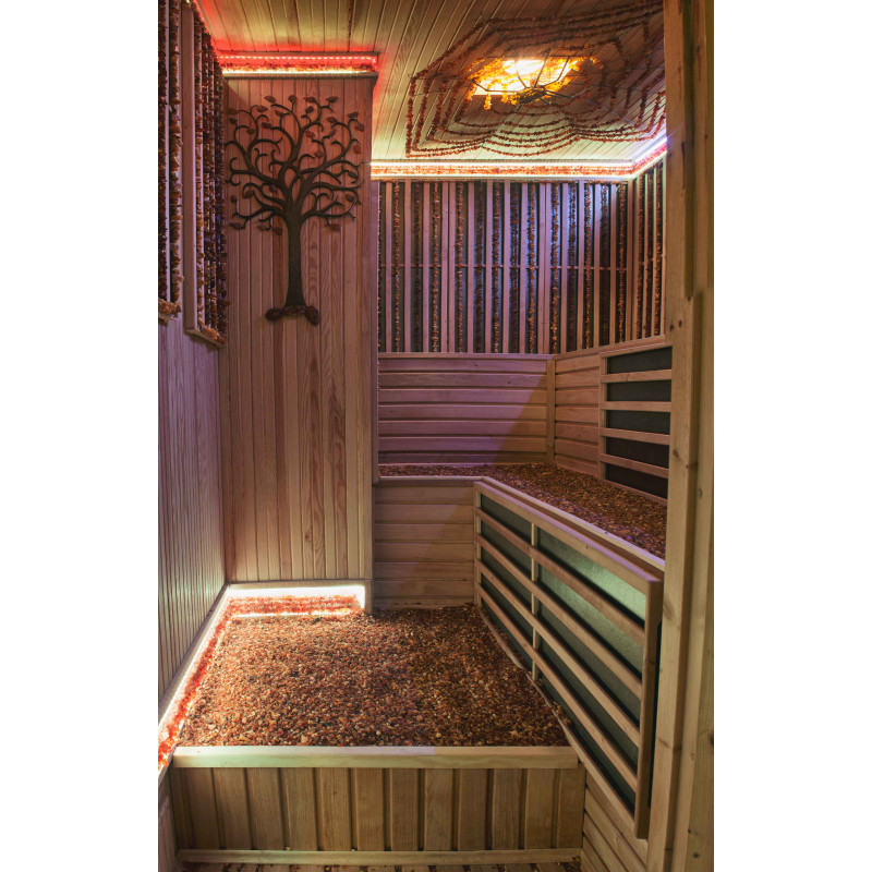 Wederopbouwwerkzaamheden in de sauna in de privé Klaipėda-kleuterschool "Pasakėlė" werden uitgevoerd. Werken en oplossingen gemaakt van barnsteen werden gemaakt door de klant.