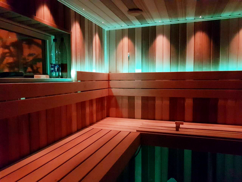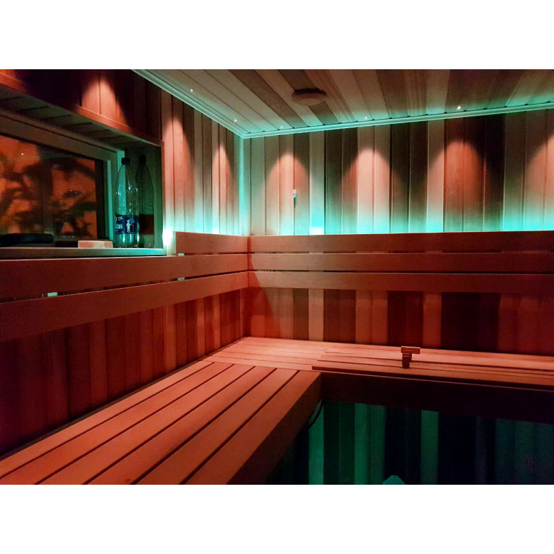 Voor stijlvolle saunaverlichting: Cariitti glasvezelverlichtingsprojector, lampen onder de rugleuningen en banken en verlichte thermometers. Armaturen kunnen van kleur veranderen - afhankelijk van uw wensen en stemming.