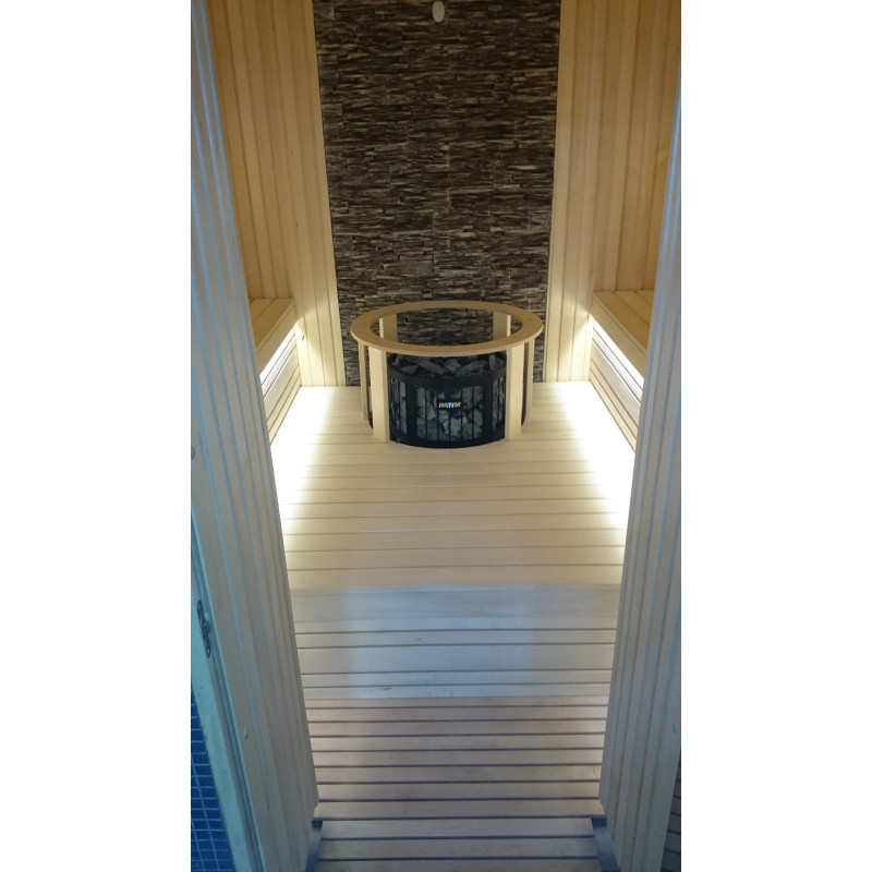 De lichte lindenhouten bekleding zorgt voor een ruimere ruimte. Originaliteit wordt gegeven door een decoratieve stenen muur in het midden van de sauna.