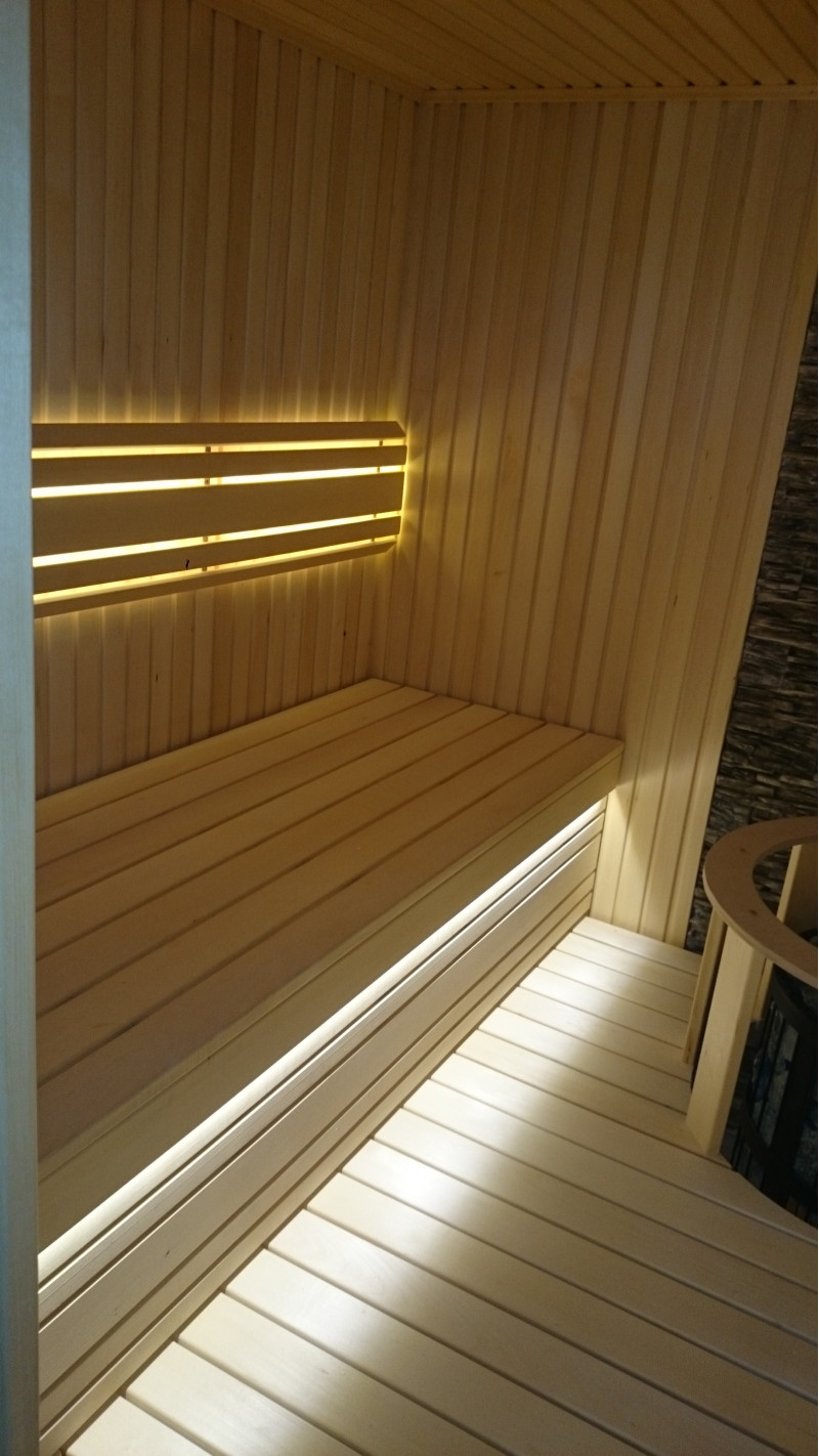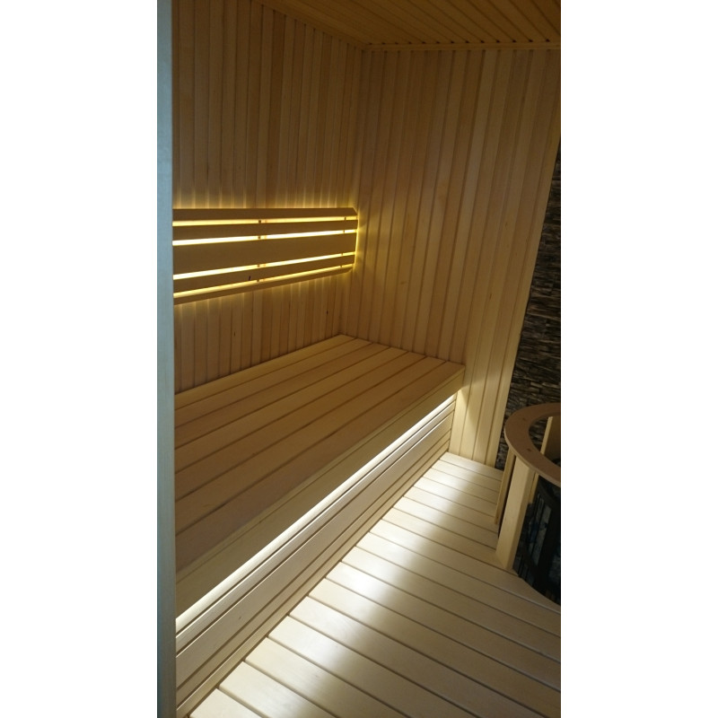 Verlichting zorgt voor de grootste gezelligheid in de sauna. In dit geval is er warmwitte led-verlichting in de rugleuningen en onder de banken geïnstalleerd.