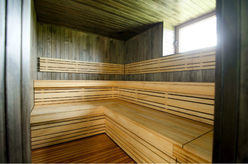 Het raam in de sauna geeft de kamer meer licht en een groter gevoel van ruimte.