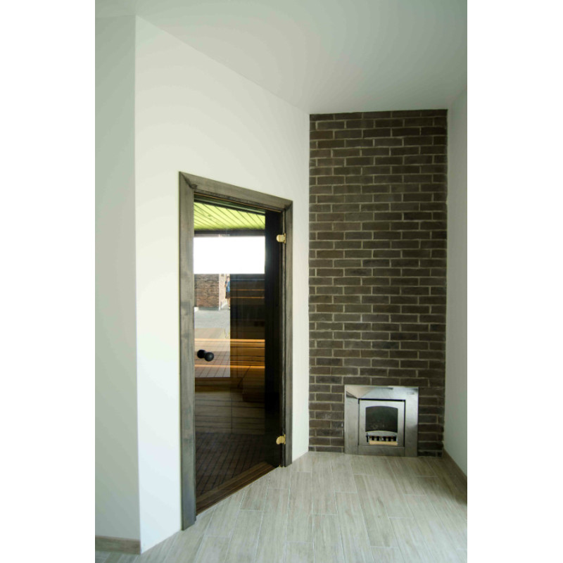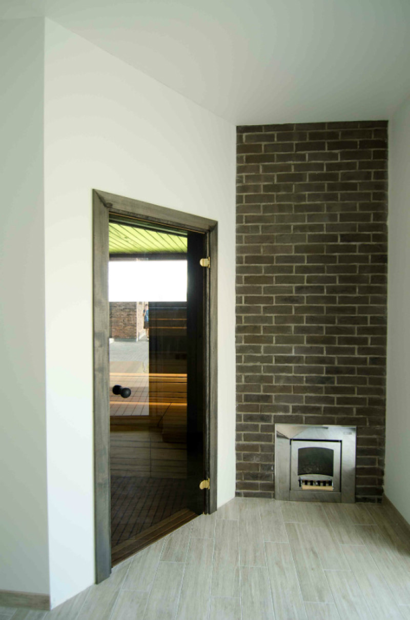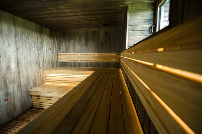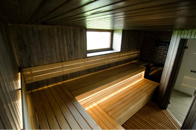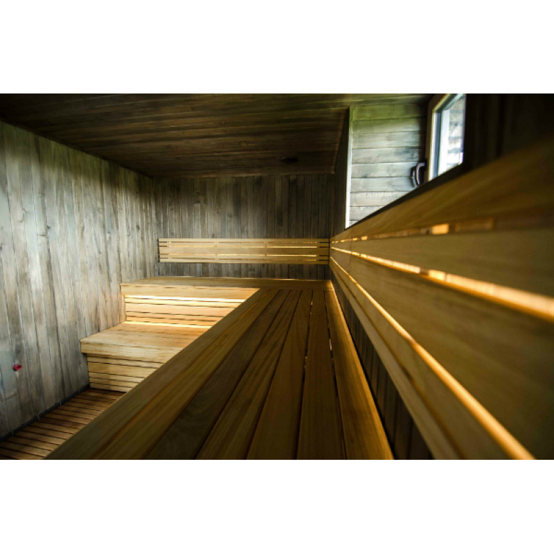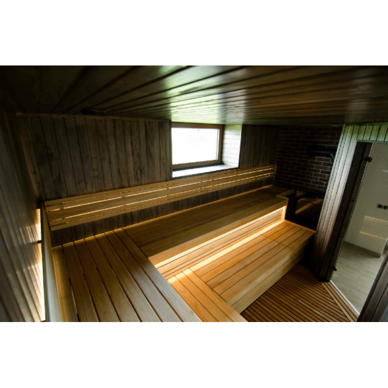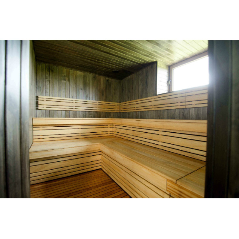 Voor de saunastoelen, rugleuningen en vloerroosters is gekozen voor hoogwaardig Afrikaans Abachi-hout. Dit hout ziet er niet alleen geweldig uit, het wordt ook niet heet, waardoor het bij aanraking onmogelijk aanbrandt. Op zulke banken is het vooral handig en plezierig om van een sauna te genieten.