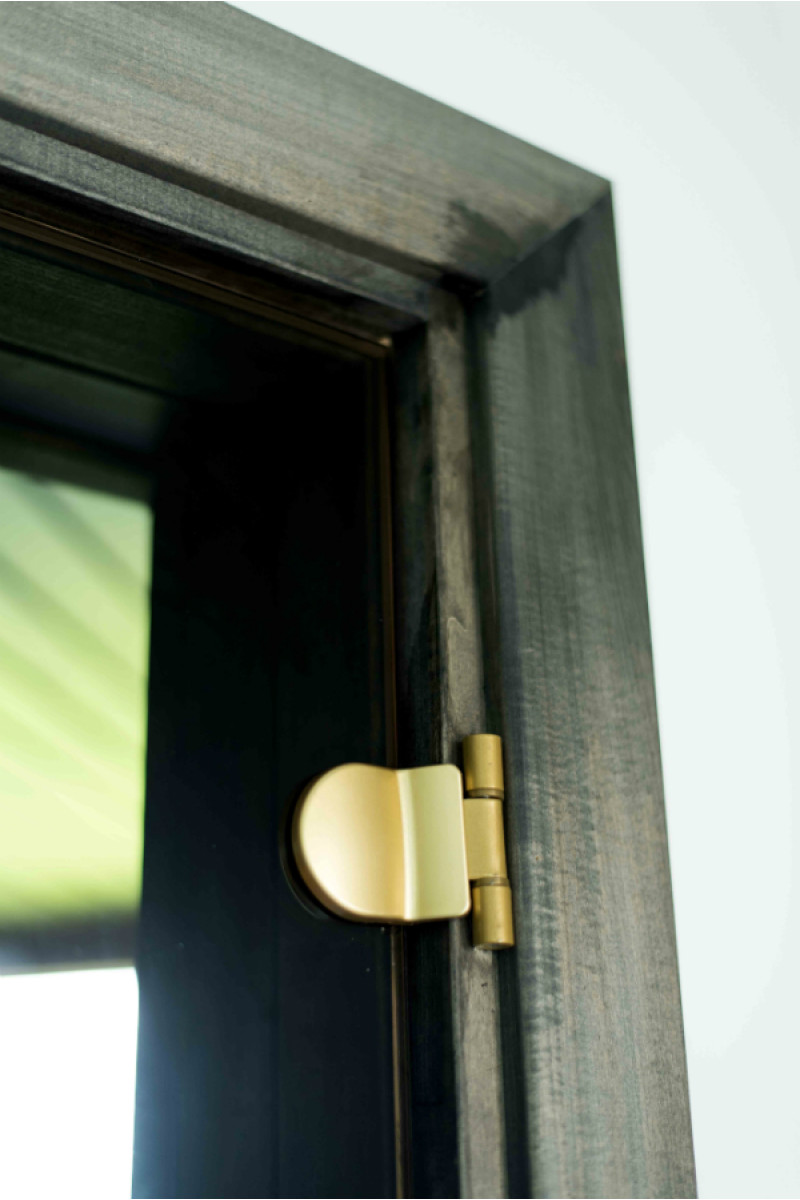 Deuren met getint gehard brons glas, lindenhouten frame en ronde handgreep.