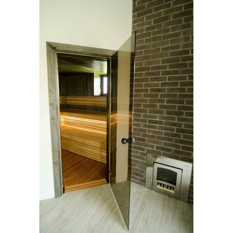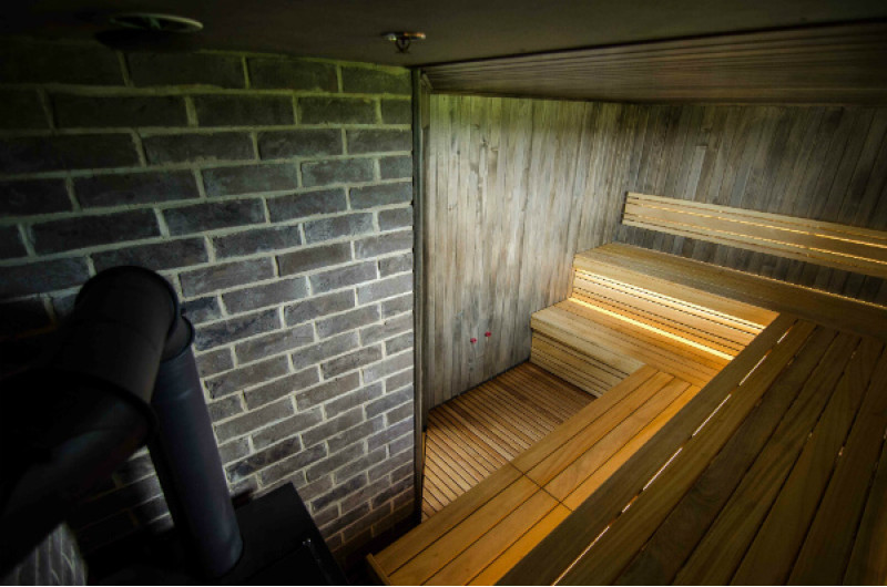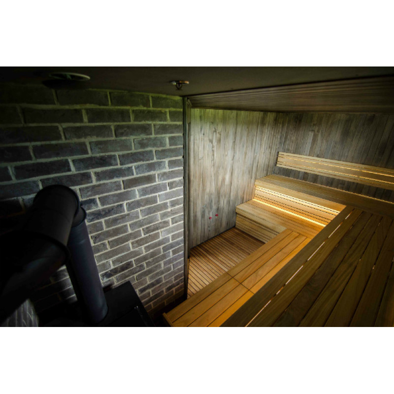 De muren en het plafond, gewaxt met een speciale zwarte wax, contrasteren met de lichte saunabanken, de ruimte oogt uniek en creëert een gezellige en moderne sfeer. Dit contrast van banken en wanden wordt nog geaccentueerd door de ingebouwde temperatuur- en vochtbestendige witte led-verlichting onder de banken en rugleuningen.