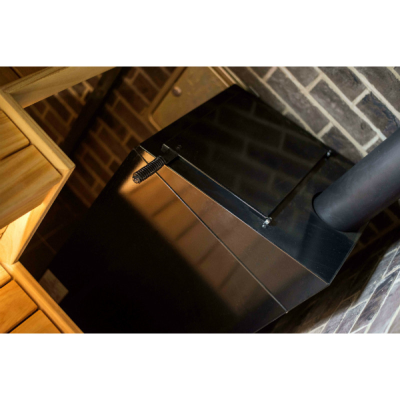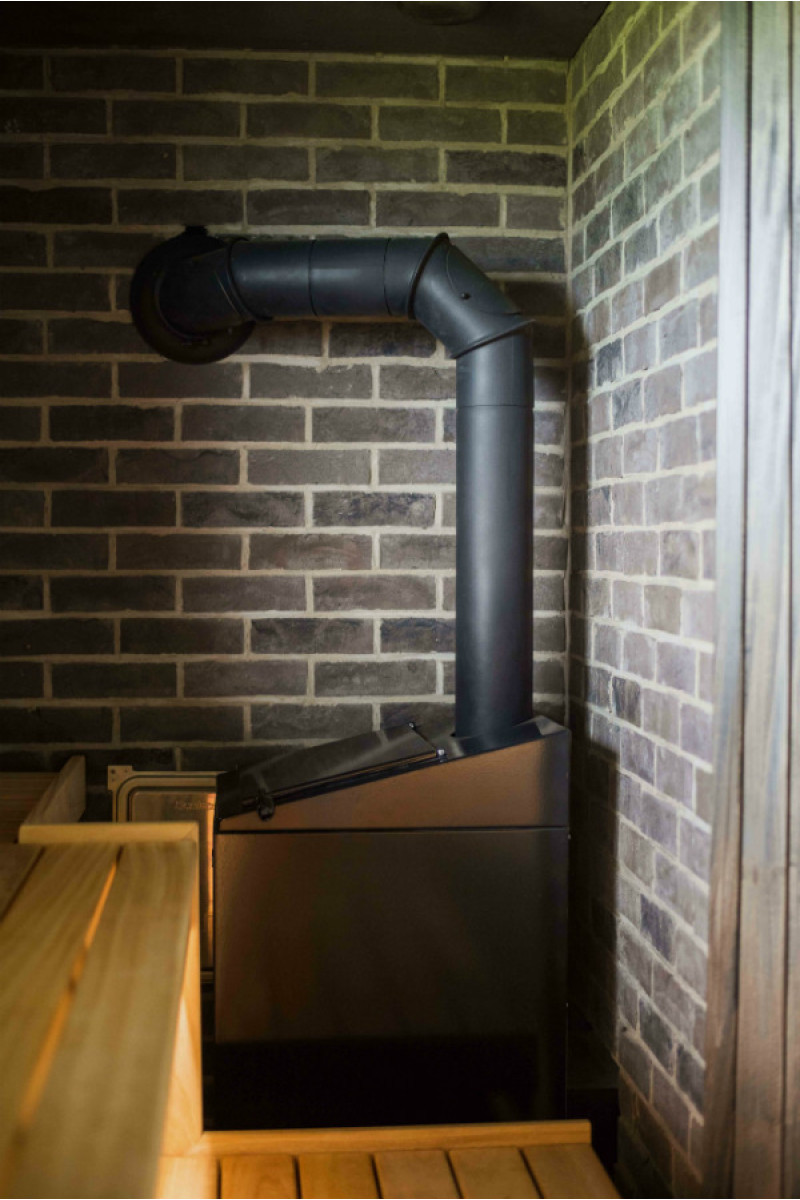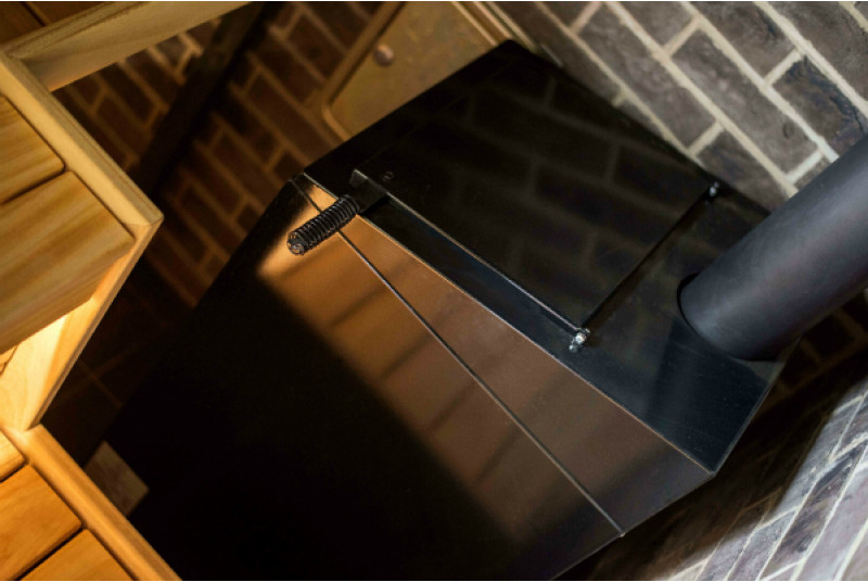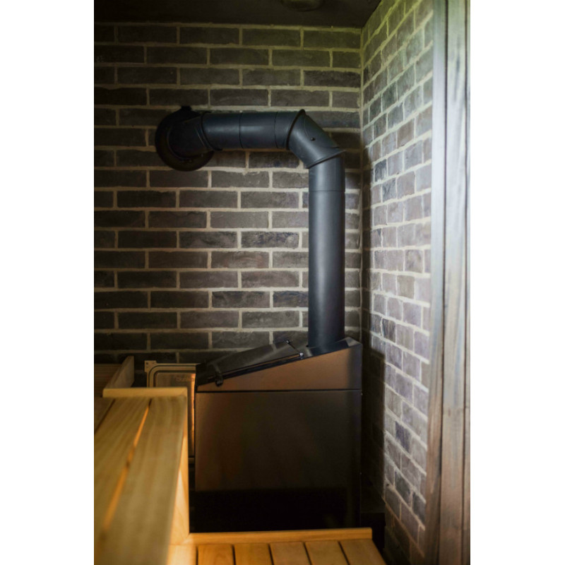De geselecteerde houtgestookte saunakachel is Narvi Steam Master Tunnel WT. Dit is een zeer hoogwaardige, warmteaccumulerende saunakachel. Deze heater kan tot 100 kg stenen bevatten. Wanneer je de bovenklep van de kachel opent en water op de hete stenen giet, krijg je veel aangename stoom.