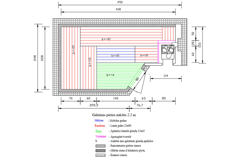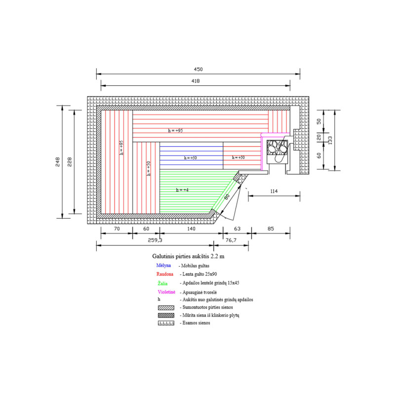 Plafond- en wandbekleding - de hoogste soort AB lindehout. Linden gevelbeplating heeft een lage thermische capaciteit, wat bijdraagt aan de snelle opwarming van de sauna. Ook bevat het lindehout een grote hoeveelheid essentiële oliën, waardoor het hout een aangename natuurlijke geur afgeeft in de sauna.