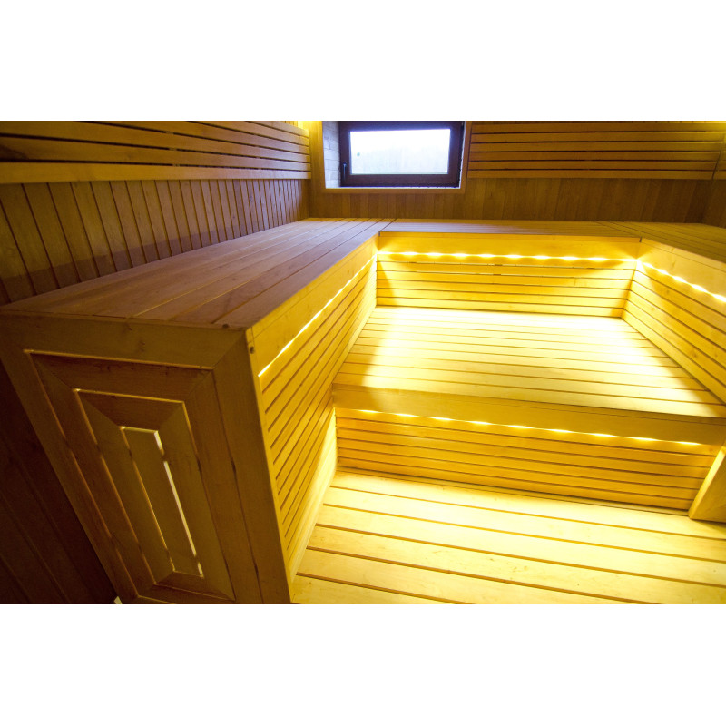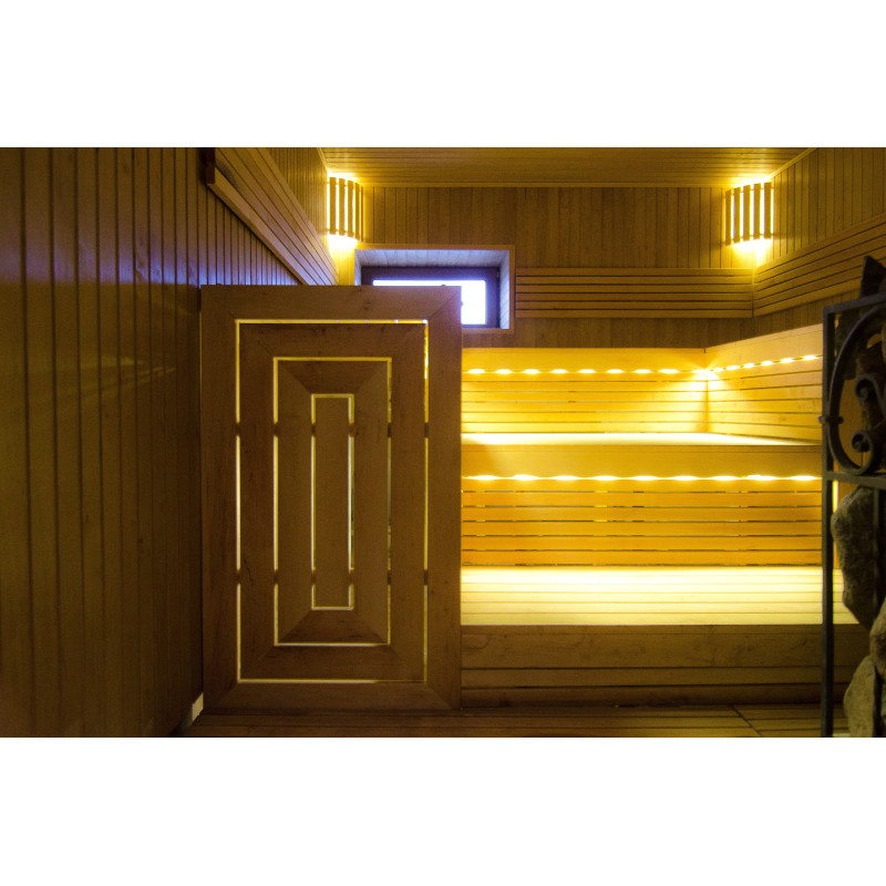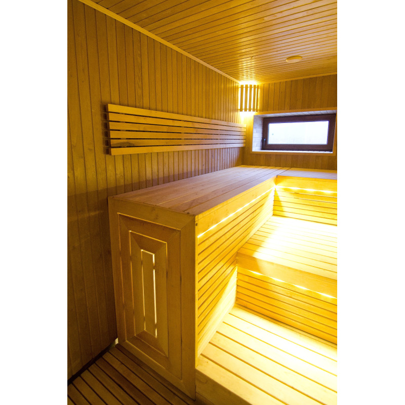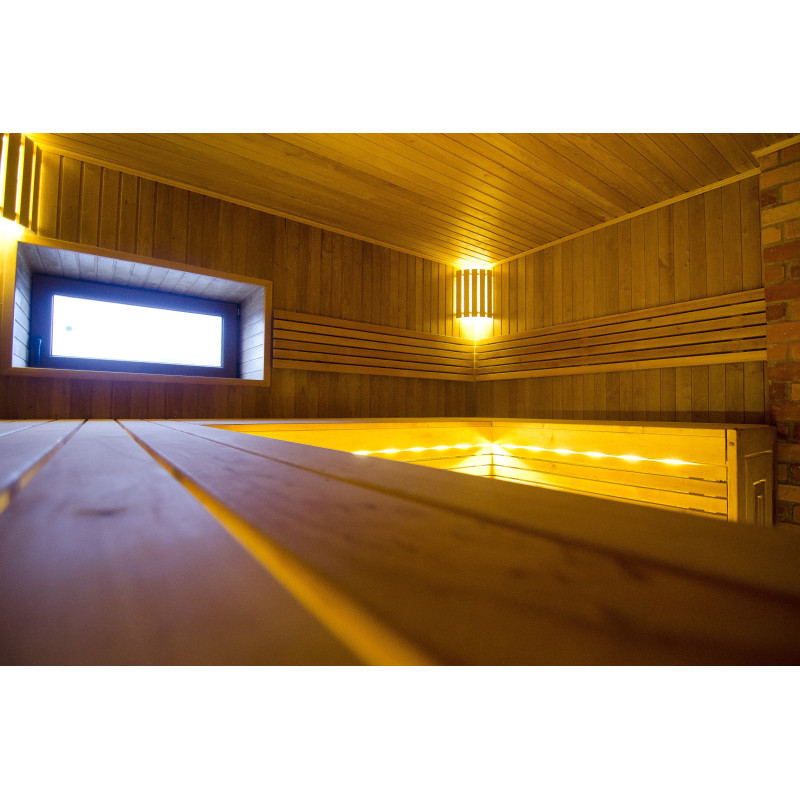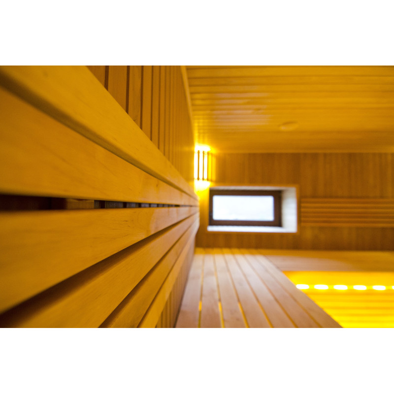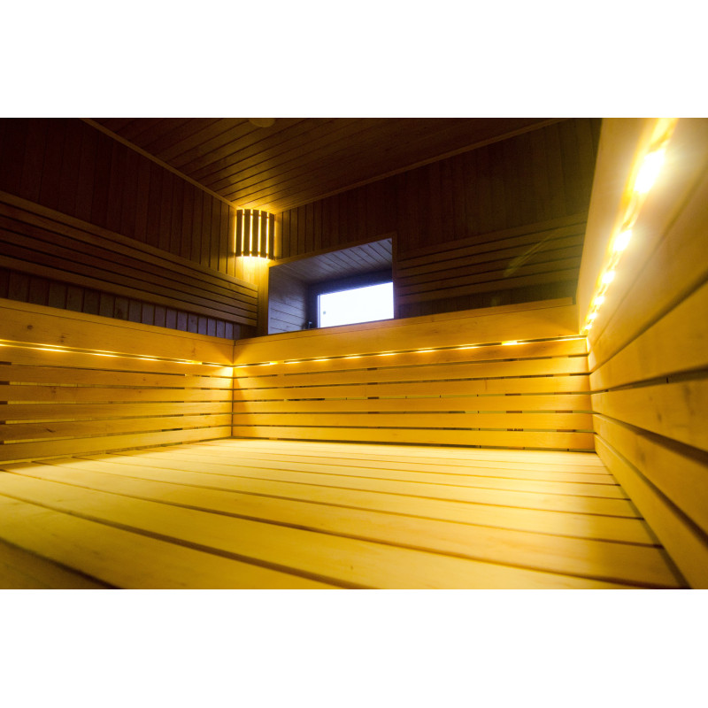 De sauna is voorzien van warmgekleurde led-verlichting onder de ligstoelen en wandlampen met houten afdekkappen.