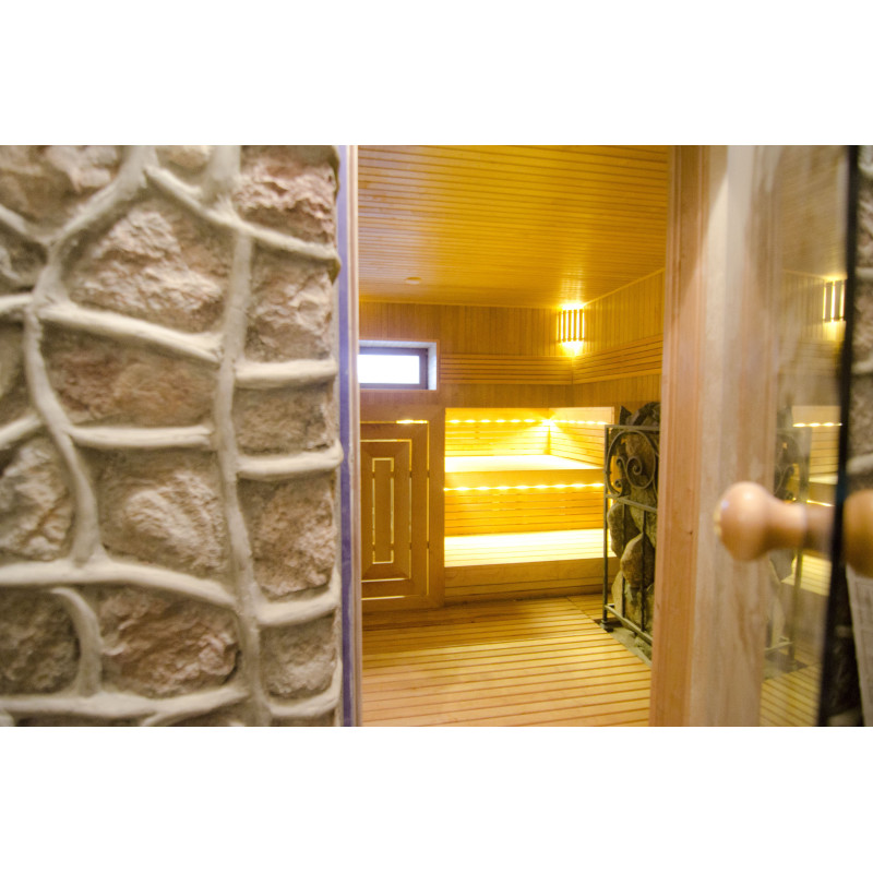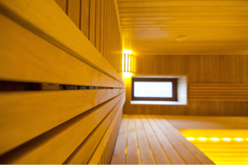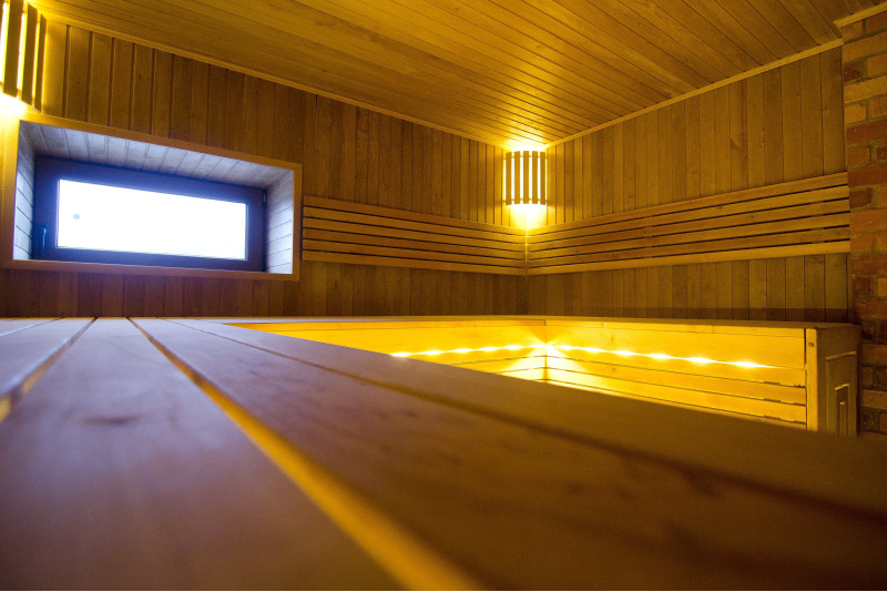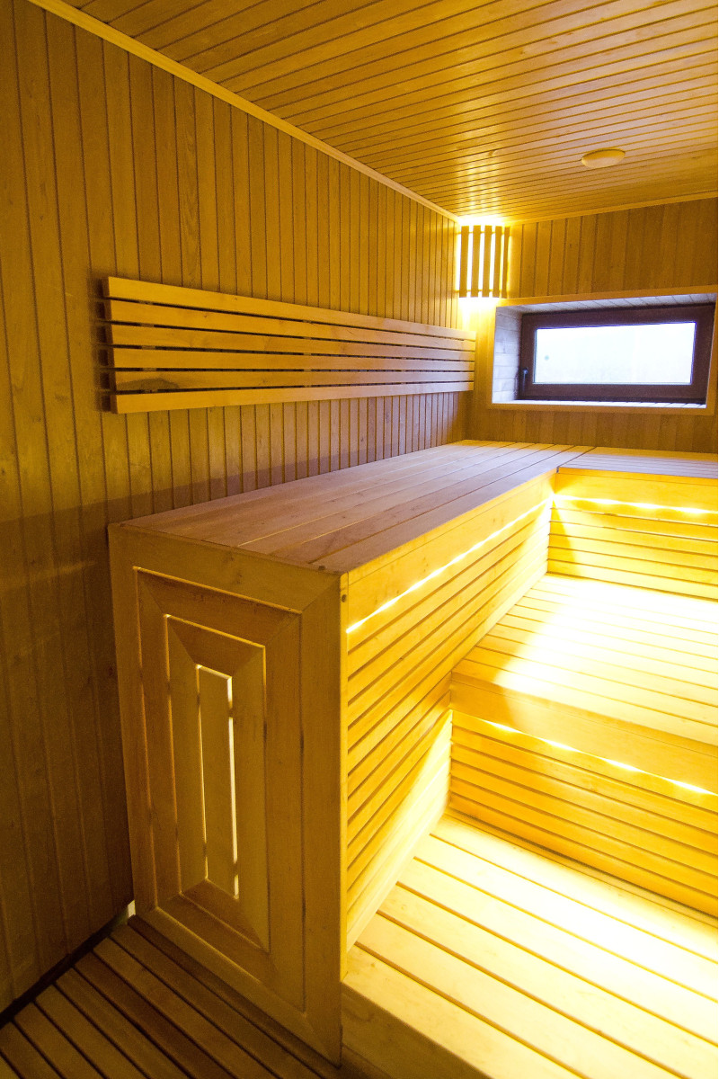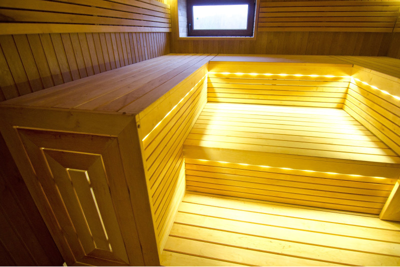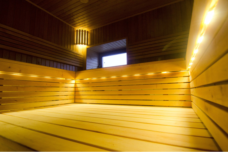 De sauna is voorzien van warmgekleurde led-verlichting onder de ligstoelen en wandlampen met houten afdekkappen.