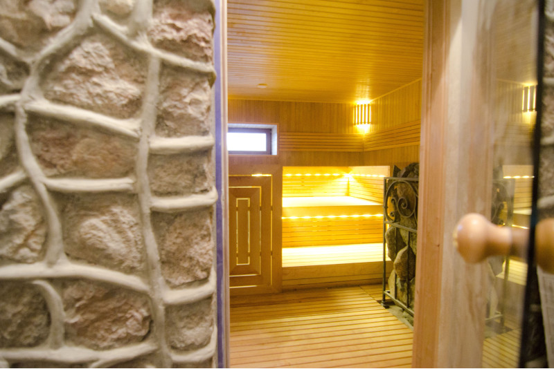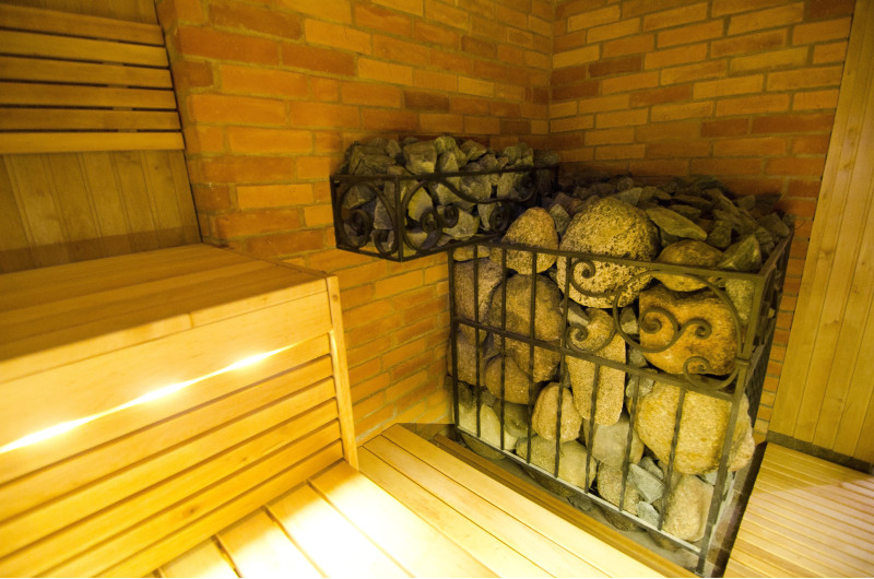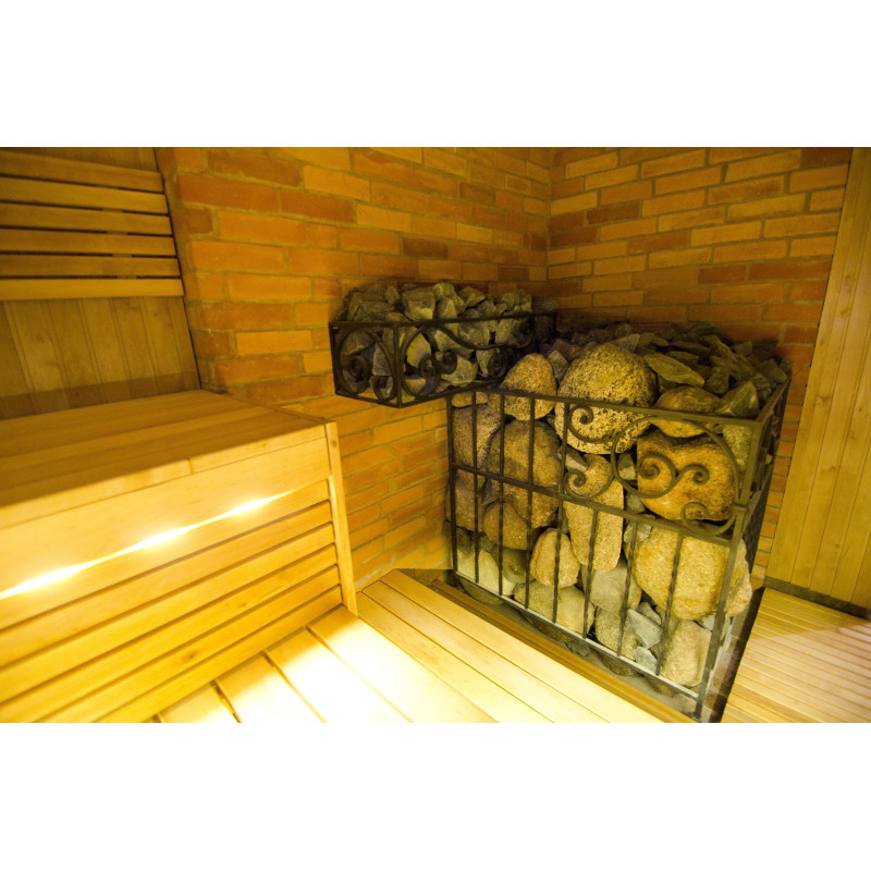 Kretinga heeft een sauna van exclusief design, waar een stilistische sluiting van de uiteinden van de banken en een smidse kachel een bijzonder beeld creëren.