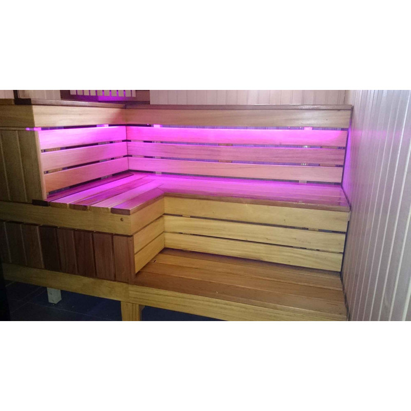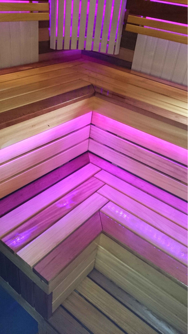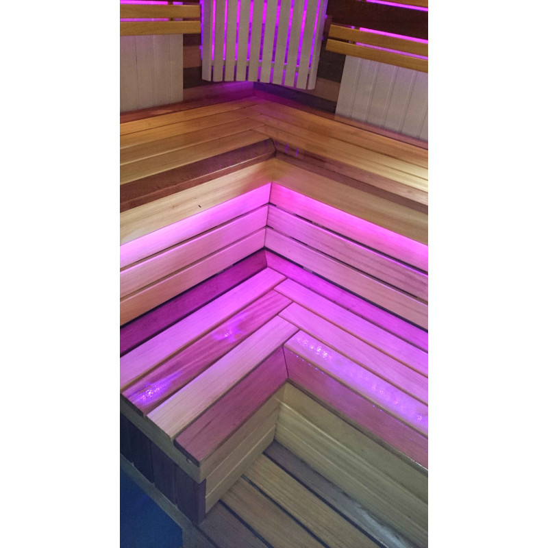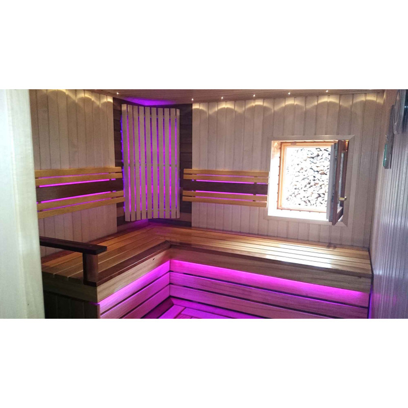De sauna is voorzien van een ventilatiesysteem. Onder de banken en achter de rugleuningen is gekleurde verlichting aangebracht, waardoor een gezellige, rustgevende omgeving ontstaat. Hanglamp Harvia met abachi houten kap. Harvia thermometer en hygrometer, twee schalen.