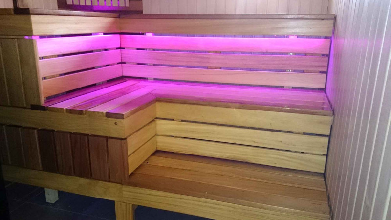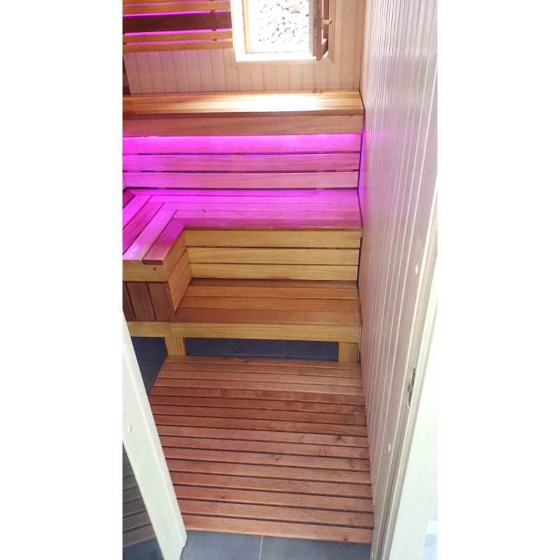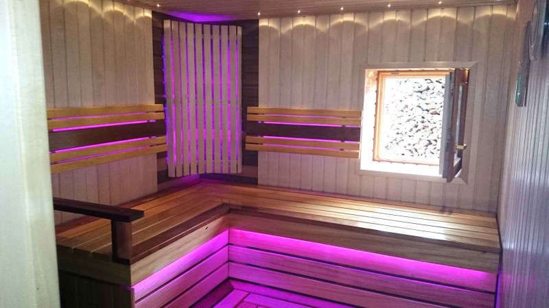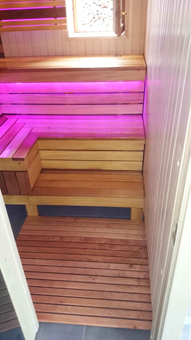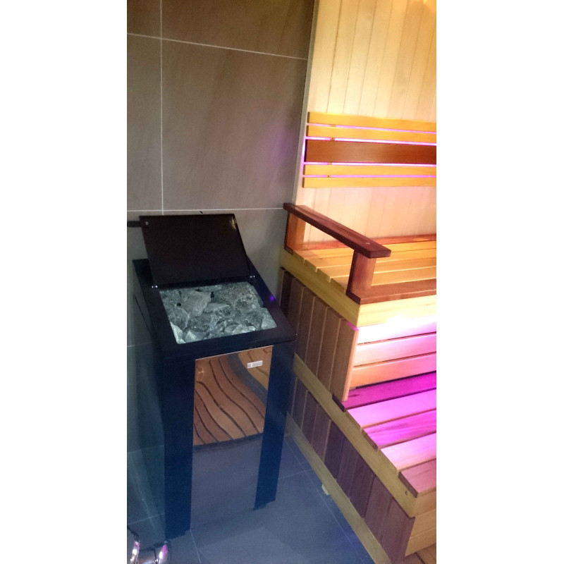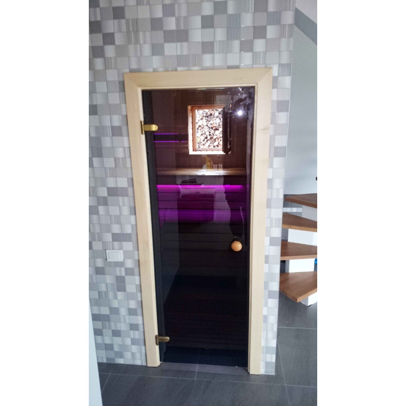 De saunabanken en lampenkap-bachrest zijn gemaakt van Afrikaanse abachihouten planken. Dit hoogwaardige hout warmt het minst op, dus het is fijn om het aan te raken in de sauna. Muren en plafonds zijn gemaakt van grenen houten lambrisering. Het raam in de sauna ondersteunt de stroom van natuurlijk licht, vergroot de ruimte en creëert een verbinding met de natuur. Vensterglas - gehard, hittebestendig, brons glas.