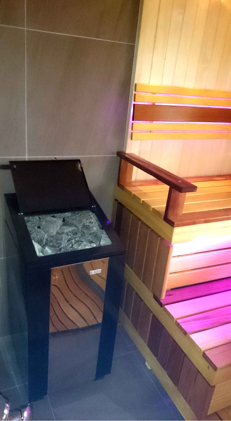 Voor de sauna is gekozen voor een zeer hoogwaardige, warmteaccumulerende, houtgestookte kachel Narvi Steam Master WT voor 10-130 m3. Bevat een zeer grote hoeveelheid stenen - 100 kg. Produceert veel aangename en kwalitatieve stoom.