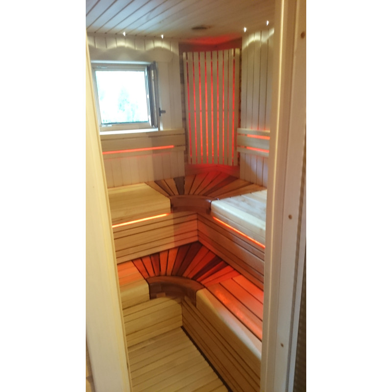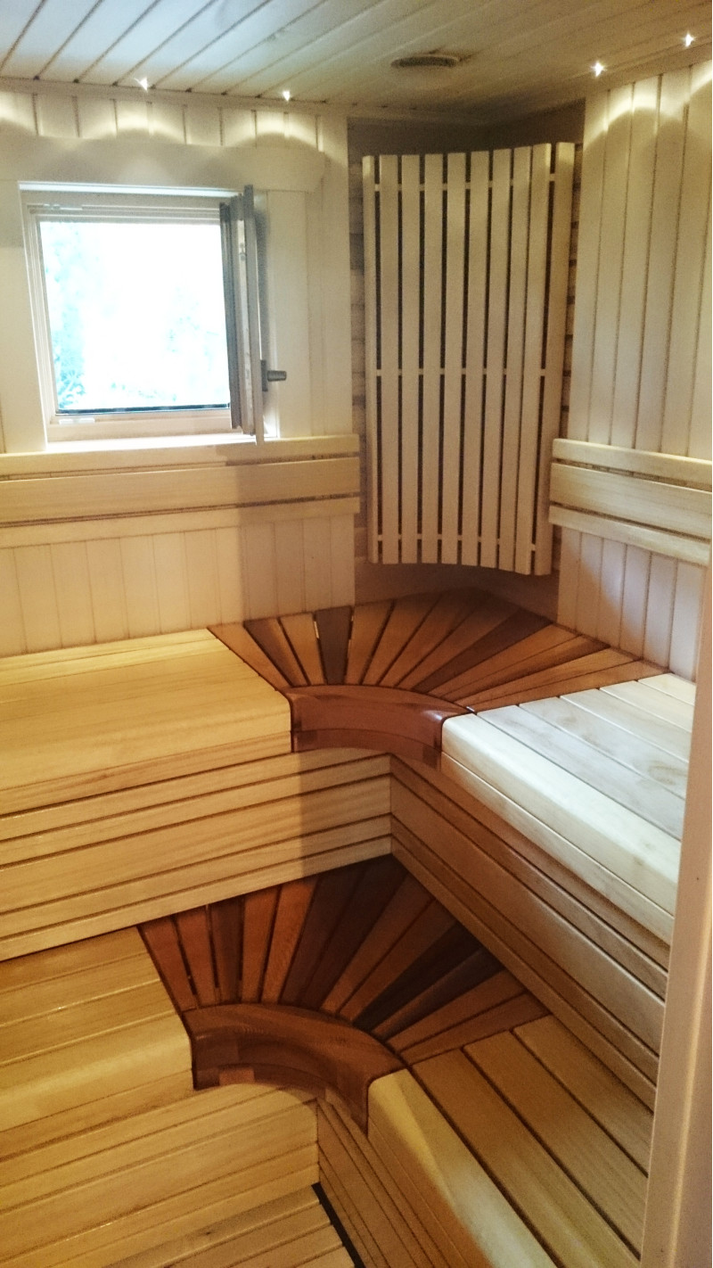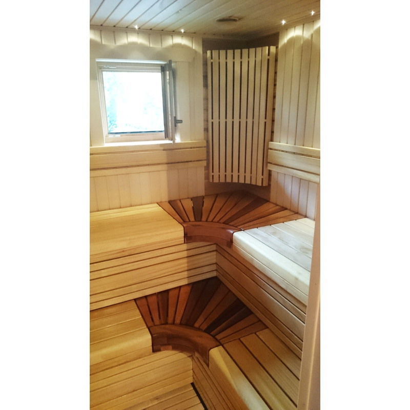 Het interieur van de sauna is gemaakt van de hoogste kwaliteit linden- en cederhout, de banken zijn gemaakt van abachi- en cederhout. Dit hout is het meest geschikt voor banken, omdat het weinig opwarmt, is het veilig en prettig om dergelijk hout aan te raken.