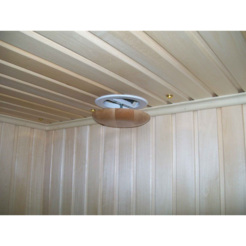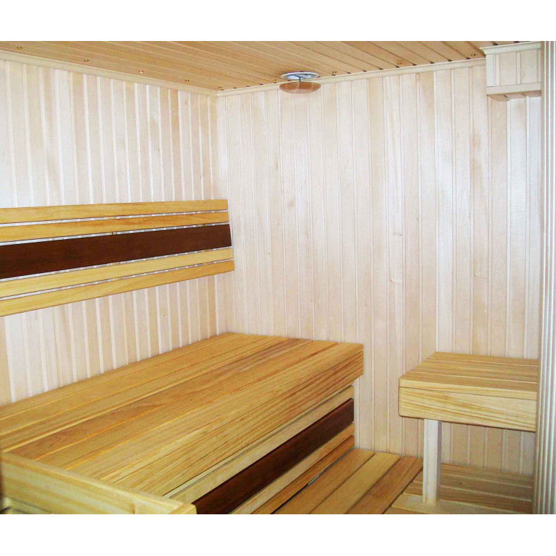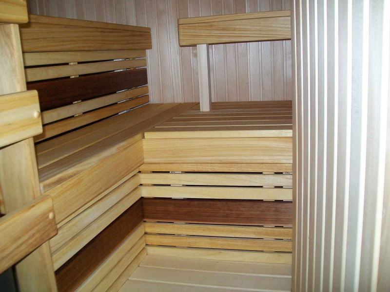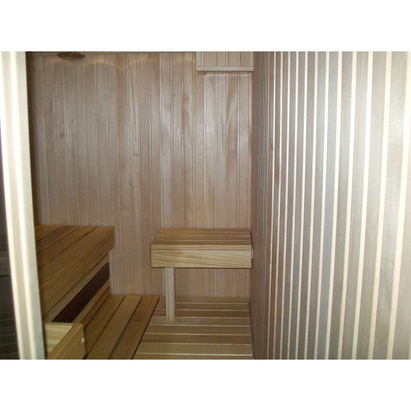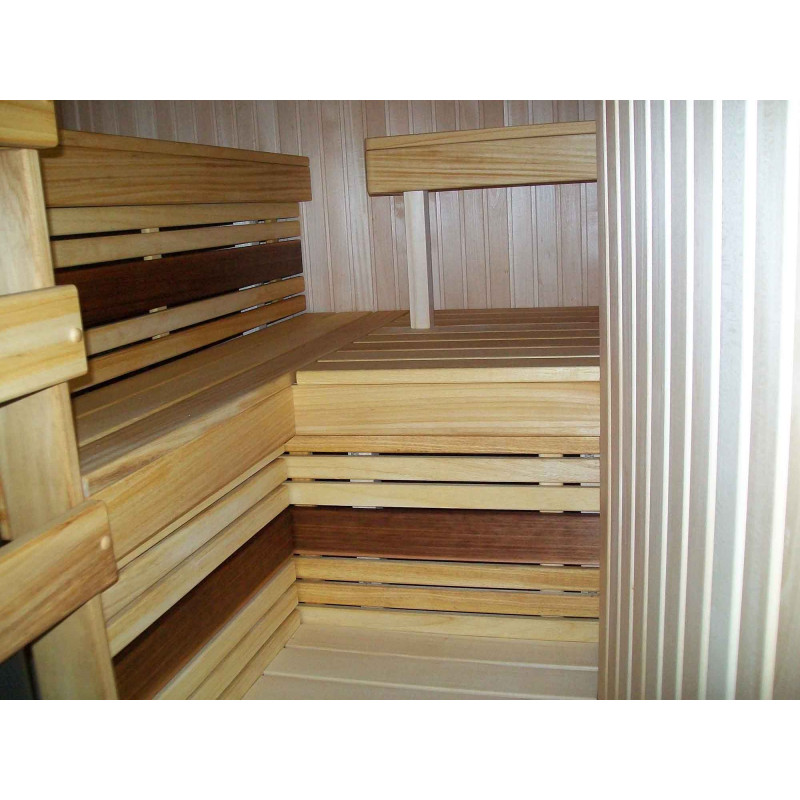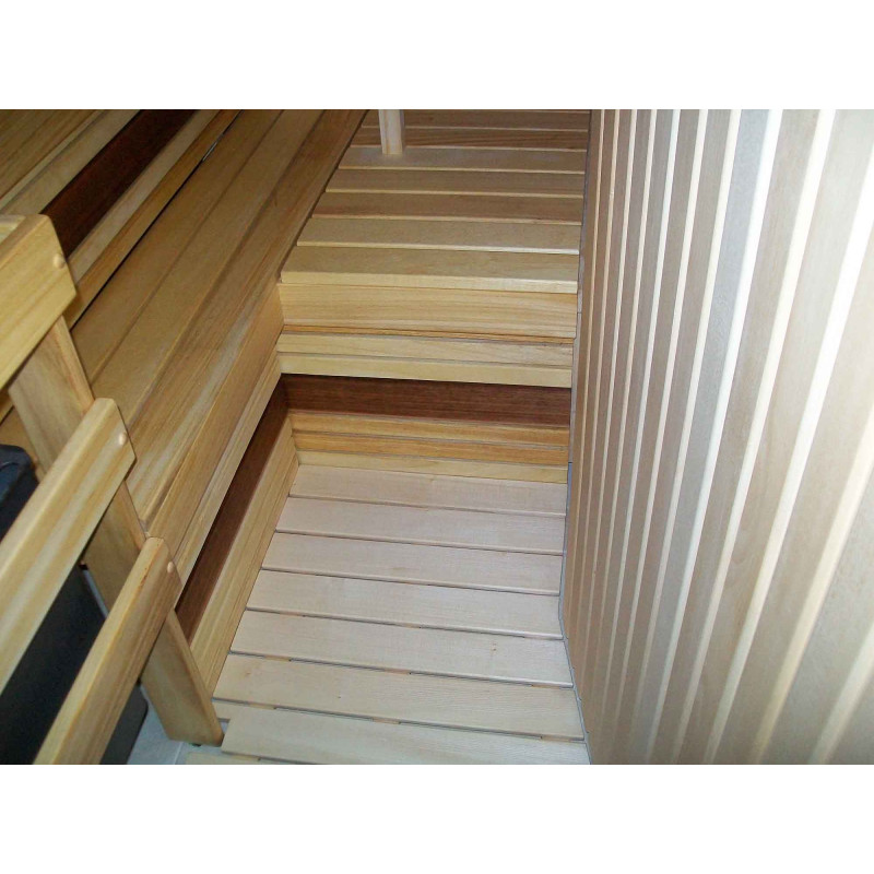 Voor de installatie van de plafonds en wanden van de sauna worden 15 mm lindenbeplating gebruikt - stijlvol, licht en met een aangename houtgeur. Voor de banken en rugleuningen is gekozen voor de hoogste kwaliteit ceder- en abachihout. Dit hout is van hoge kwaliteit, ziet er niet alleen mooi uit, maar warmt ook het minst op in vergelijking met andere houtsoorten, dus het is lekker veilig om dergelijke banken aan te raken. Vloerrooster - zwart elzenhout.