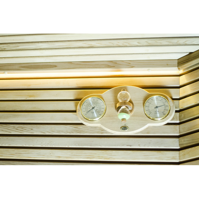 Sauna accessoires: emmer en pollepel set, houten thermometer met hygrometer en zandloper.