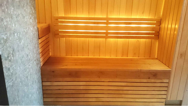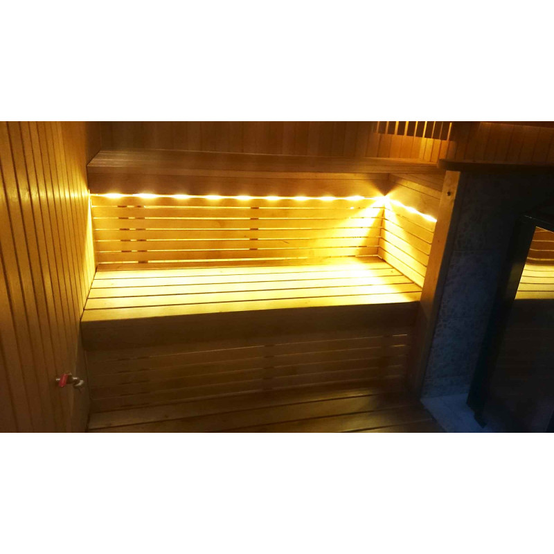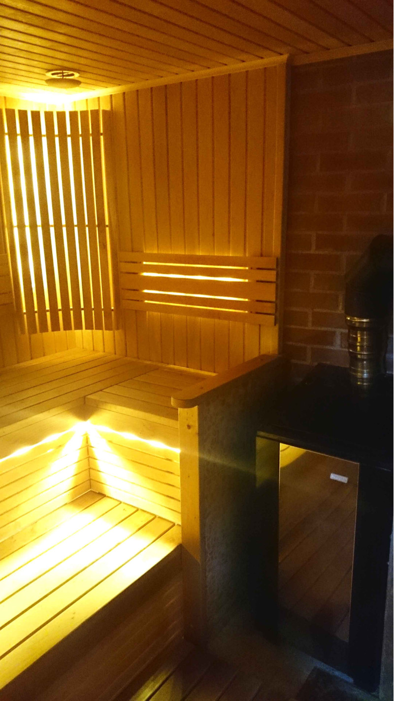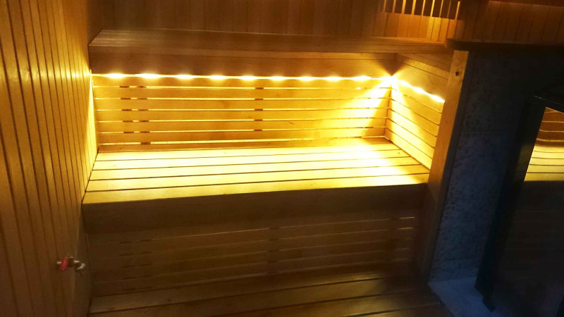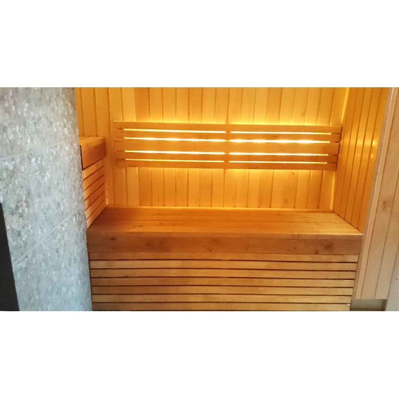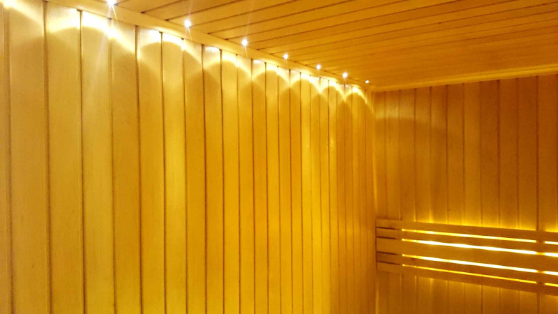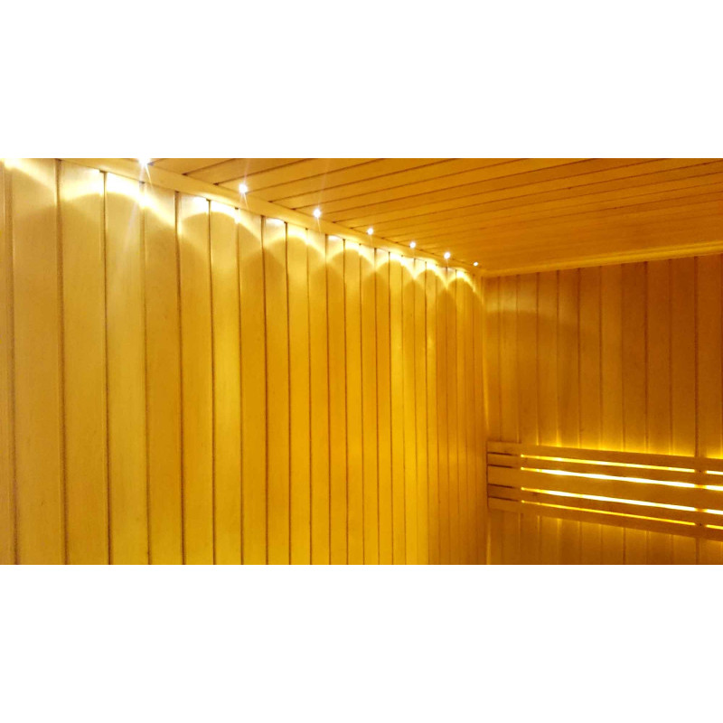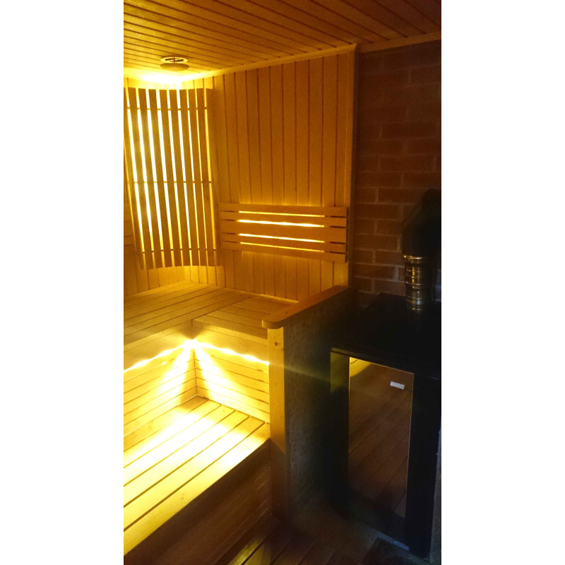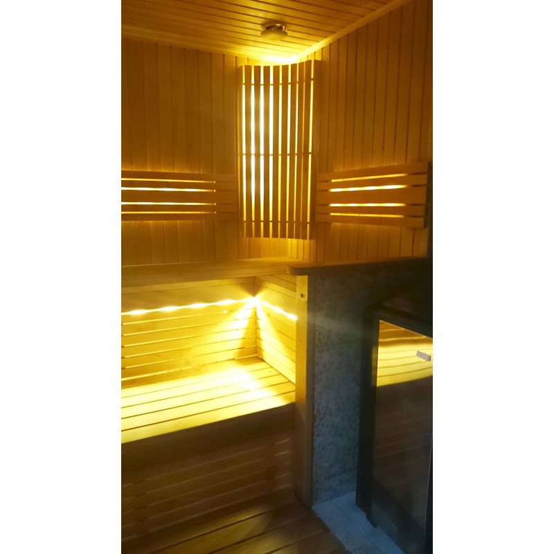 Saunaverlichting is een zeer belangrijk element, omdat het de verlichting is die voor een deel zorgt voor het ontspannende effect van de sauna. Deze sauna is voorzien van led-verlichting aan het plafond, onder de ligbedden en rugleuningen. Armaturen zijn bestand tegen vocht en hoge temperaturen.