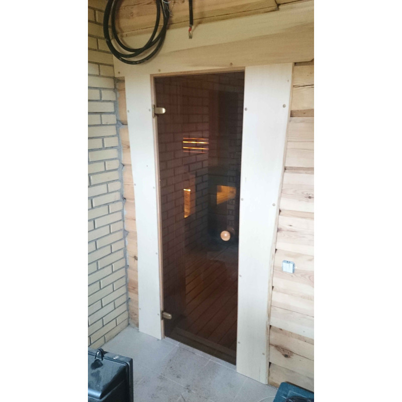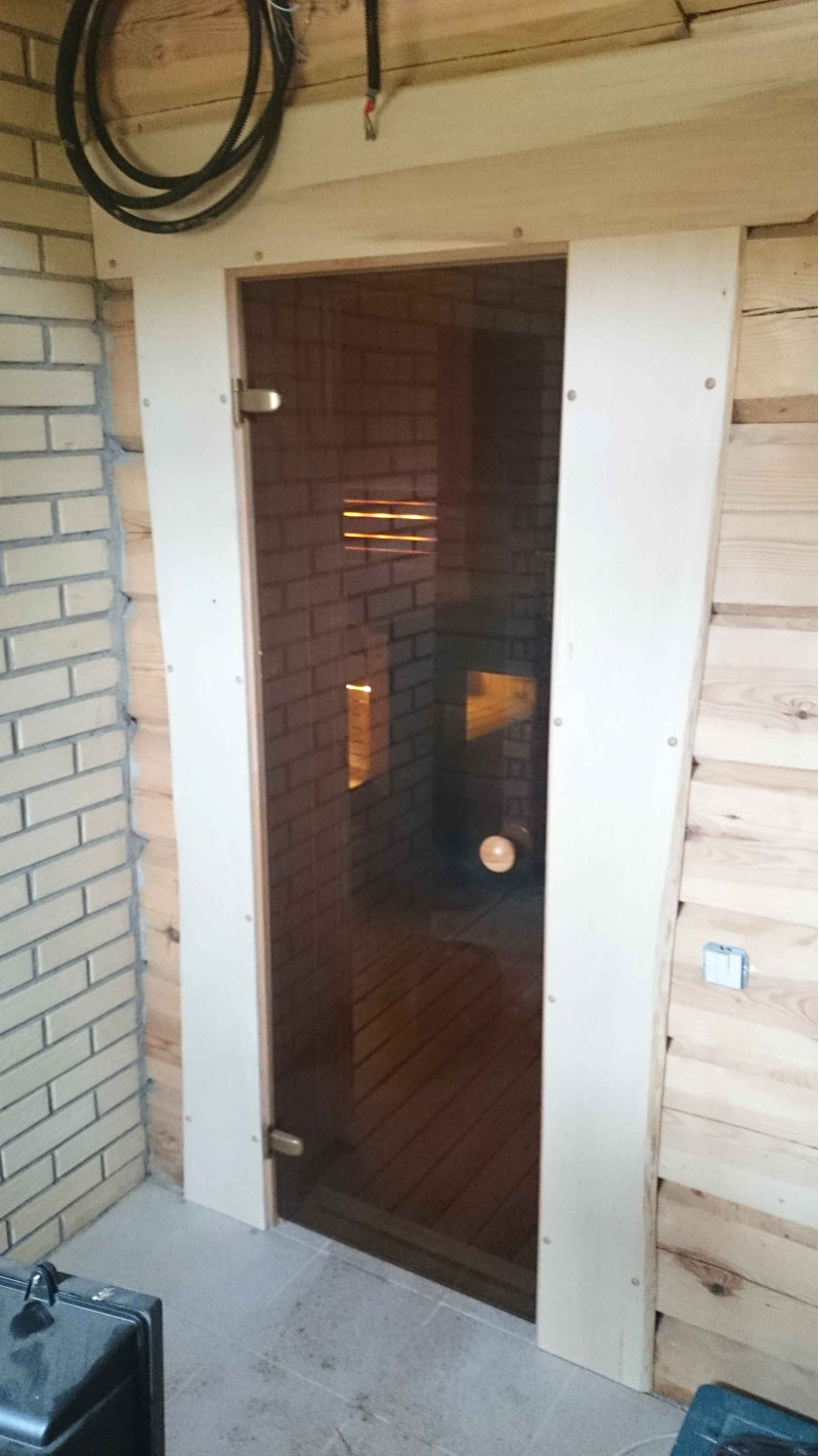 Deuren - getint gehard glas met een ronde houten handgreep.