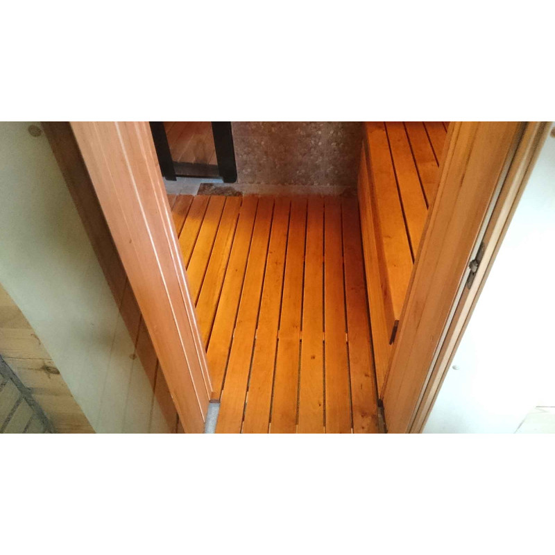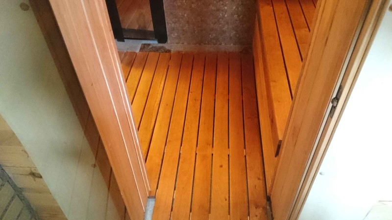 De sauna is voorzien van een heater geschikt voor intensief gebruik - Narvi Steam Master. Het krachtige apparaat kan tot 100 kg stenen bevatten. Deze kachel van het gesloten type verzamelt warmte en produceert veel stoom. Warmte hoopt zich op onder een gesloten deksel in grote hoeveelheden stenen. Zo raakt de sauna niet oververhit en droogt de lucht niet uit. Water wordt op de stenen gegoten door het deksel te openen.