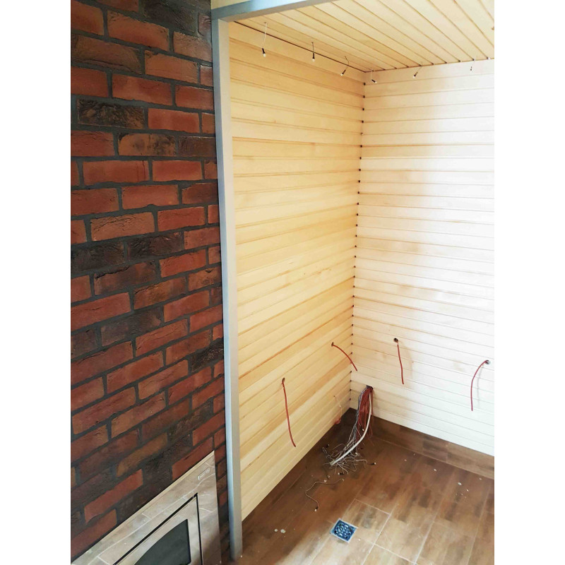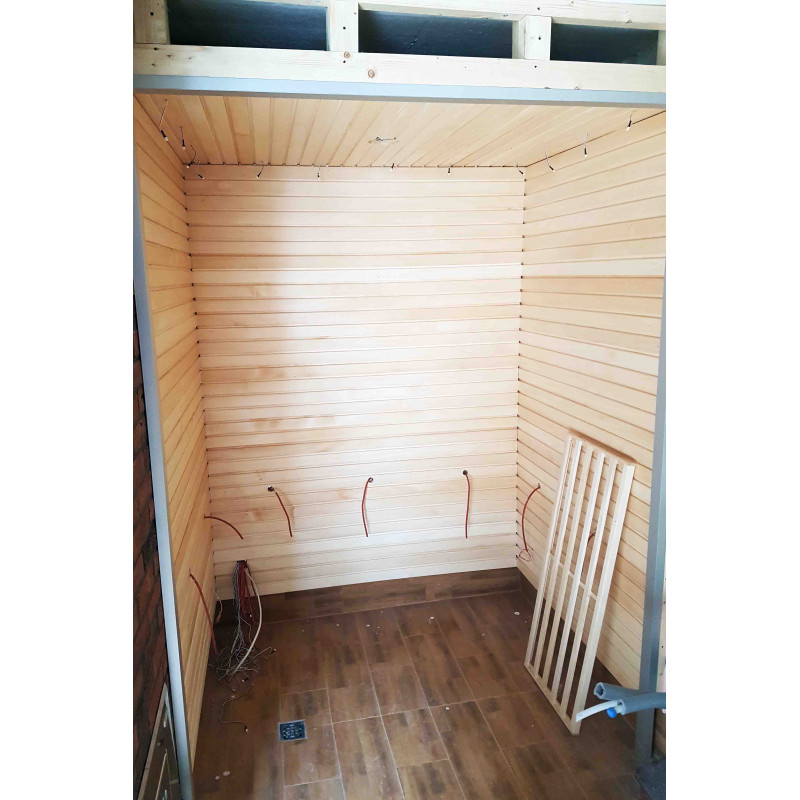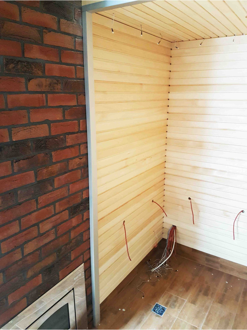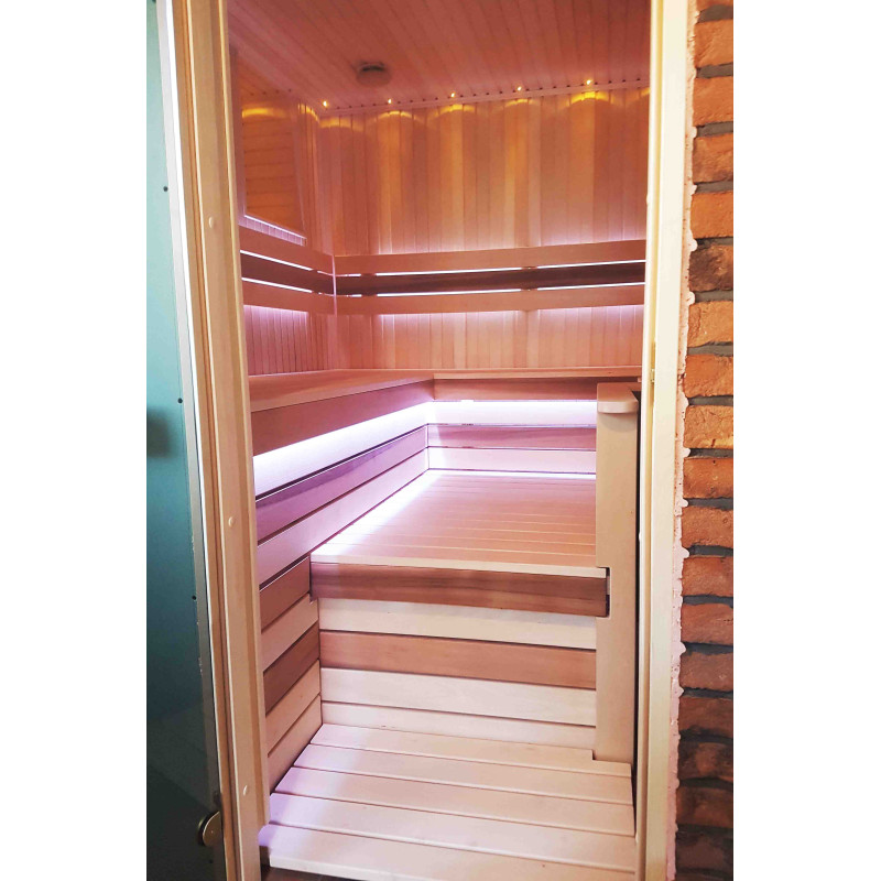 Plafonds, wanden en banken zijn gemaakt van lindehout met decoratieve cederhouten elementen. Zwart elzen vloerrooster. Banksteunen en wanden zijn gelakt en in de was gezet, waardoor de duurzaamheid van het hout wordt gegarandeerd.