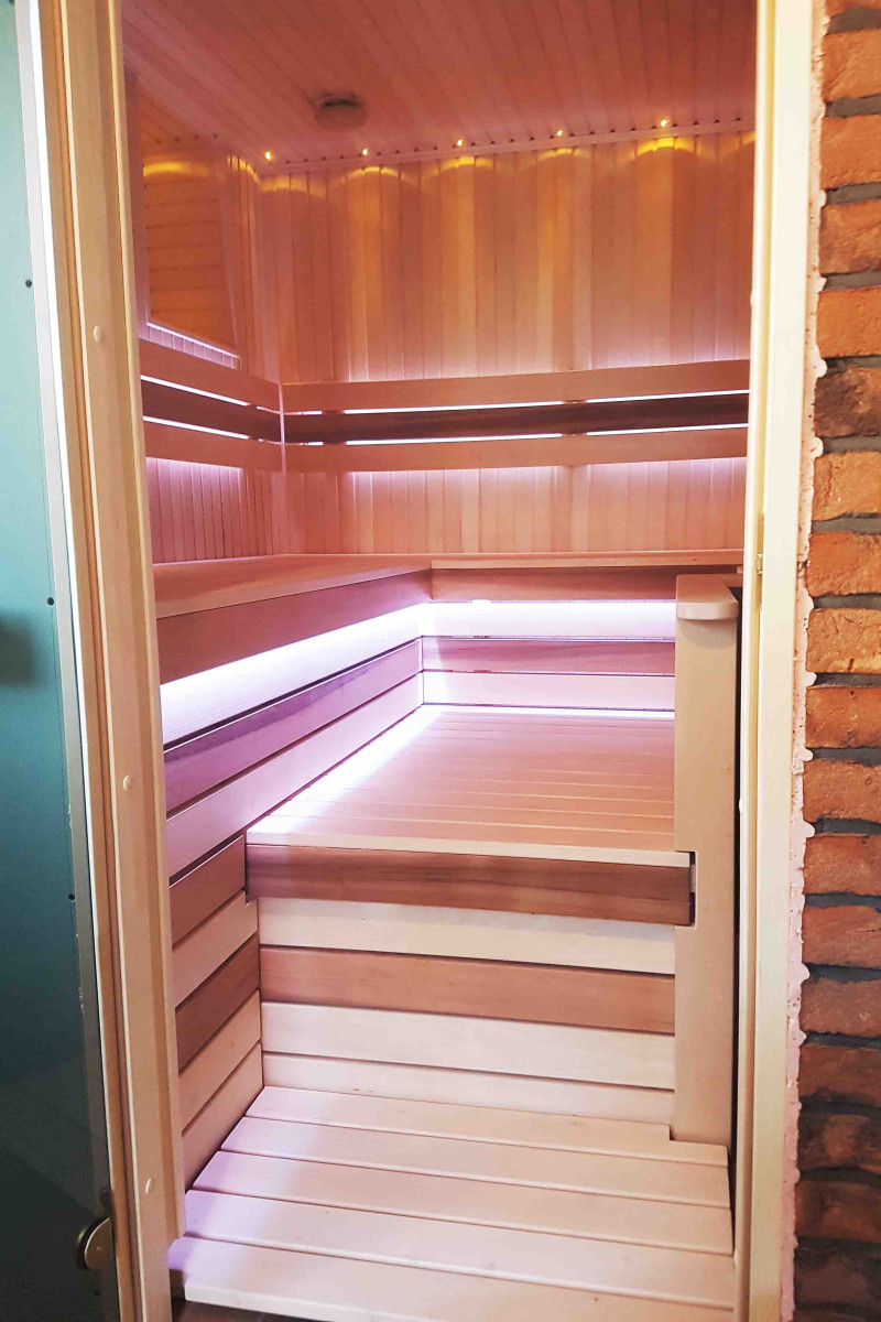 Vocht- en hittebestendige saunaverlichting - LED "Sun" is geïnstalleerd. Onder de ligstoelen en in de rugleuningen - RGB-kleurenverlichting aangestuurd door een externe kleurwisselaar.