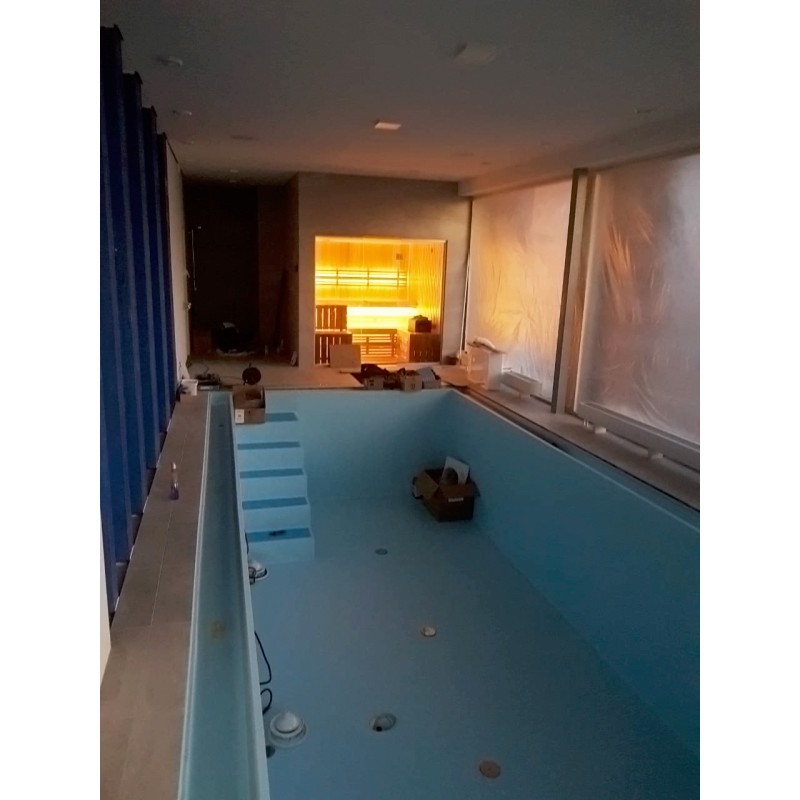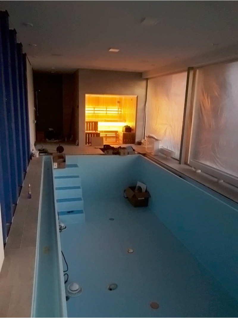 Installatie van een glazen vitrine - getint 8 mm gehard glas in een aluminium frame. Dankzij de glazen vitrine opent het zicht op het zwembad, wordt de kleine saunaruimte vergroot en krijgt de sauna meer licht.