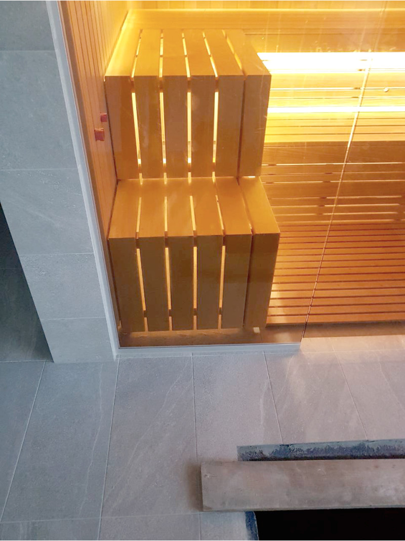 Voor de wanden en het plafond van de sauna werd lichte lindehoutbeplating gebruikt. Deze gevelbeplating straalt een aangename, natuurlijke geur van hout uit, krimpt niet van de hitte en verliest zijn elegante uitstraling niet.