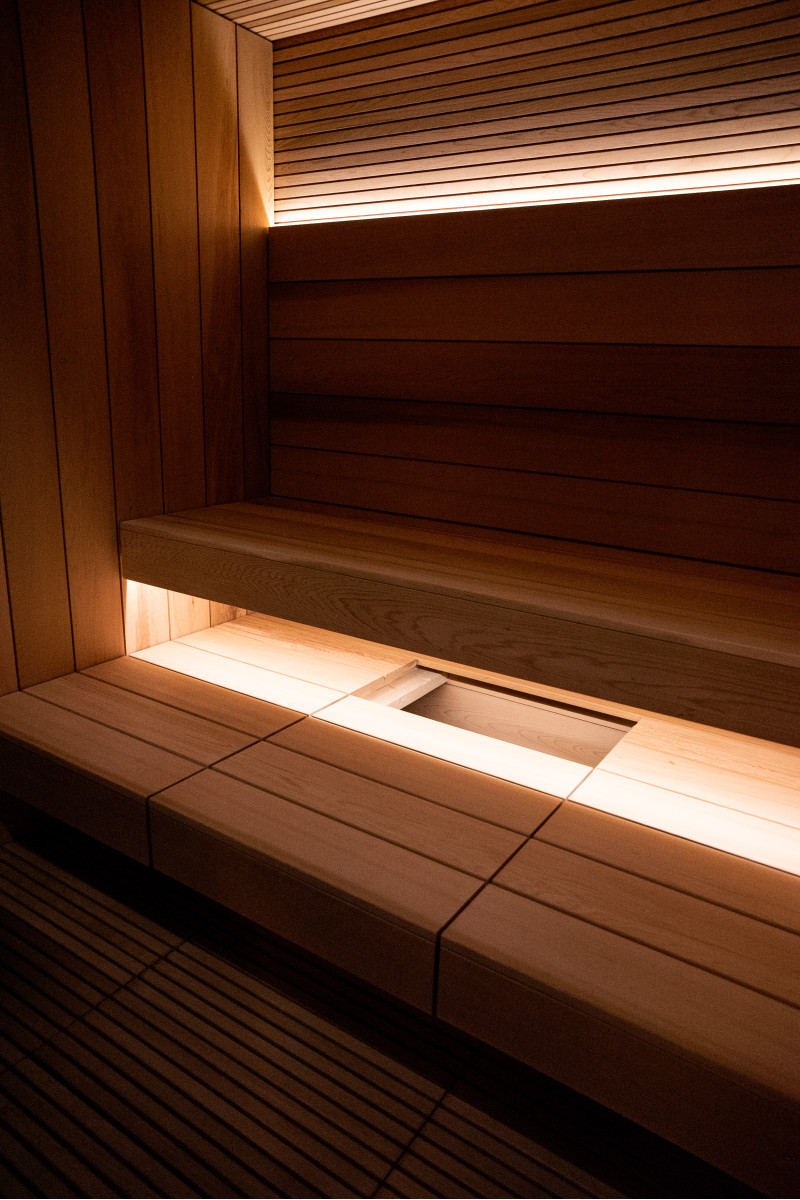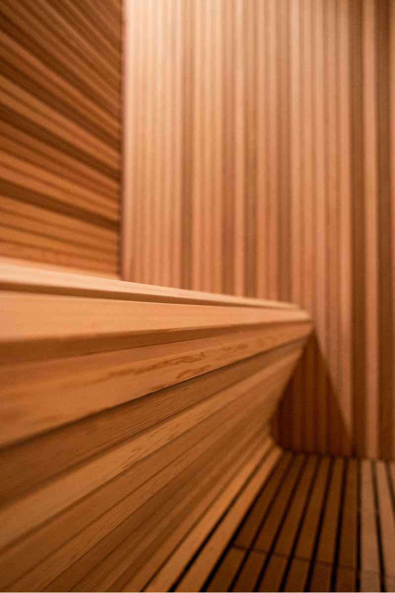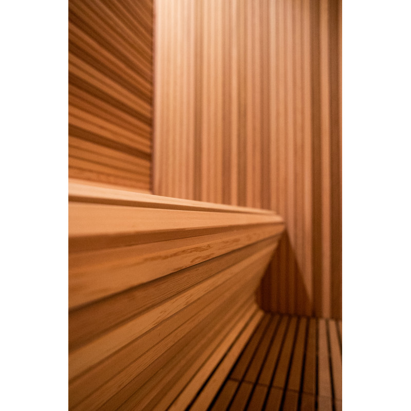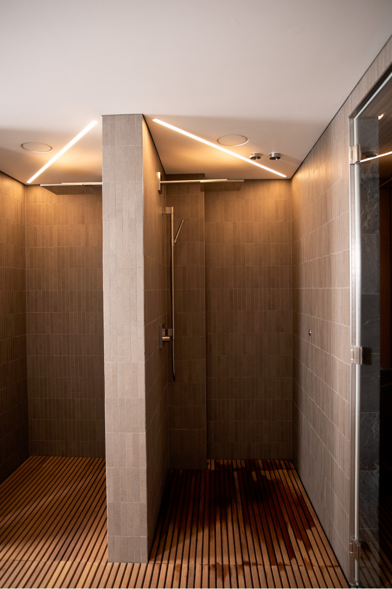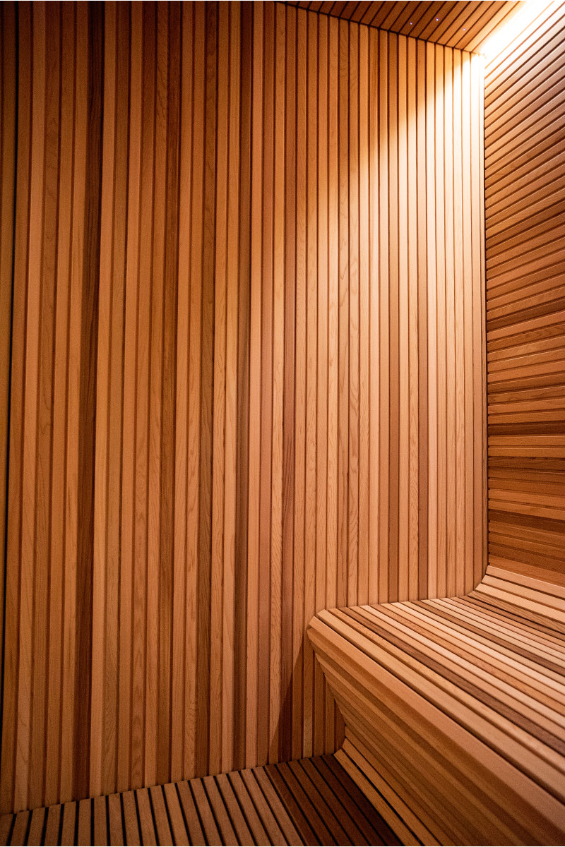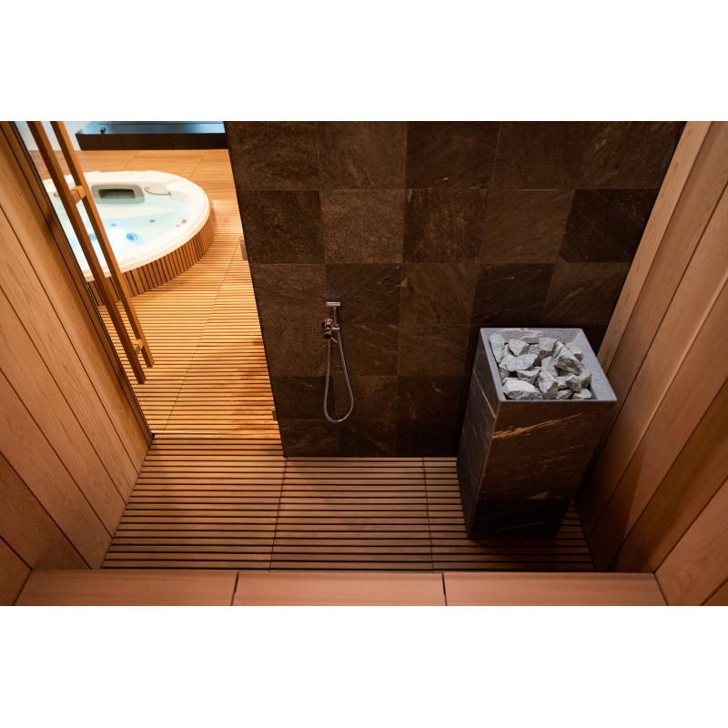 In de gehele SPA-ruimte ligt een vloer met natuurlijke Iroko-houtroosters , die zowel duurzaamheid als een verfijnde esthetiek bieden.