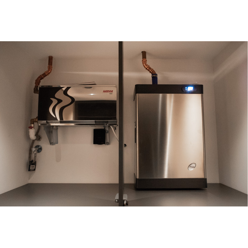 Harvia ZG-520 stoomsproeier en PEGO ES12N (9kW) stoomgenerator, bediend via FCU 5000 bedieningspaneel met temperatuursensor;