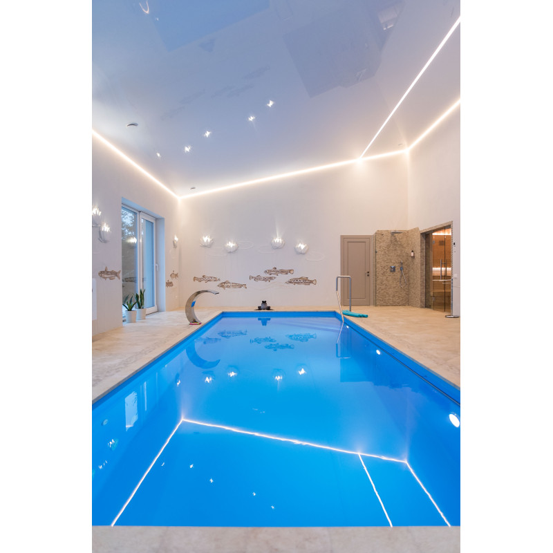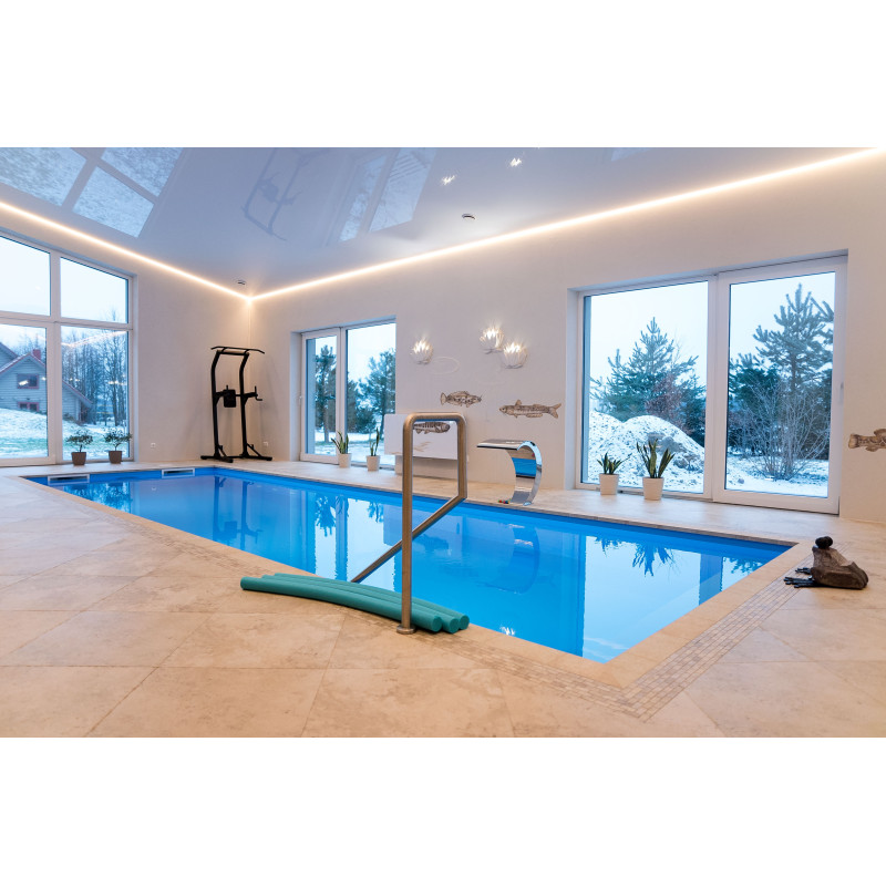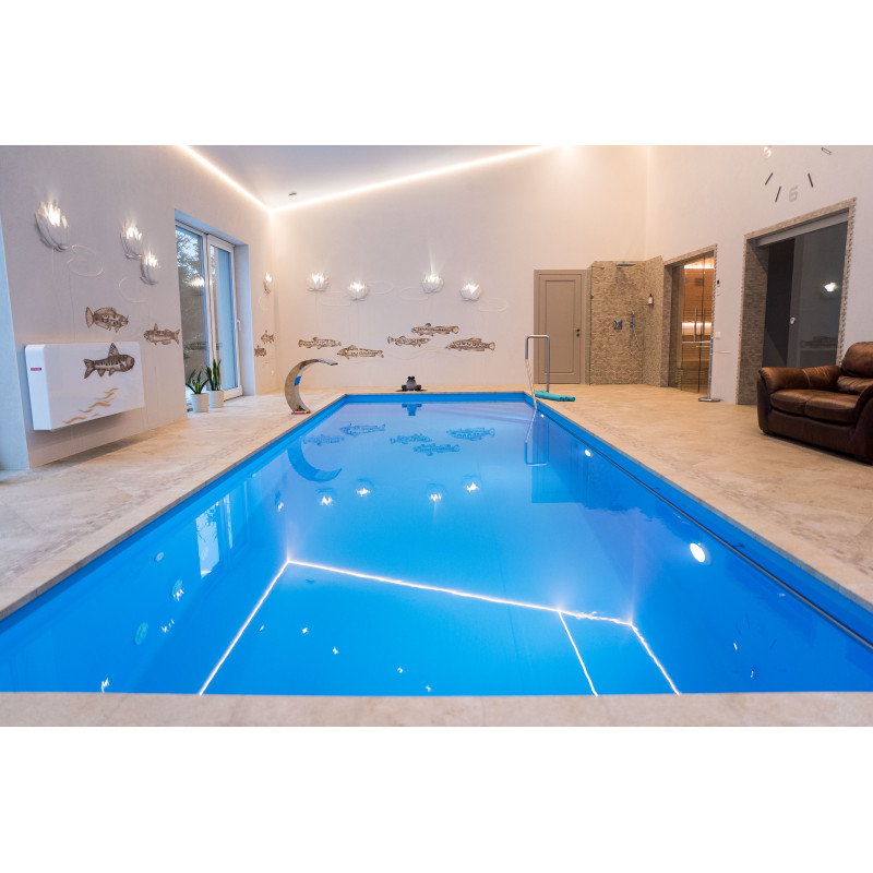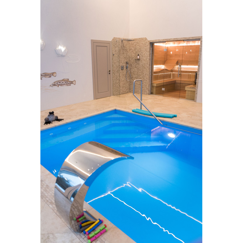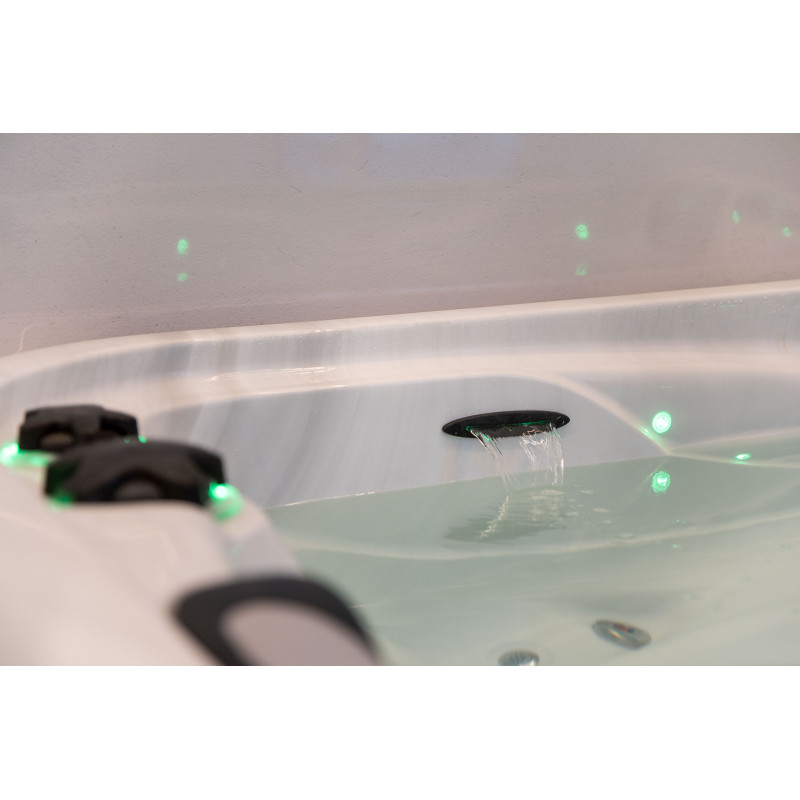 Voorzien van zwemstroom, watercascade, massagebank, leuning, trap en onderwaterverlichting.