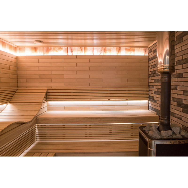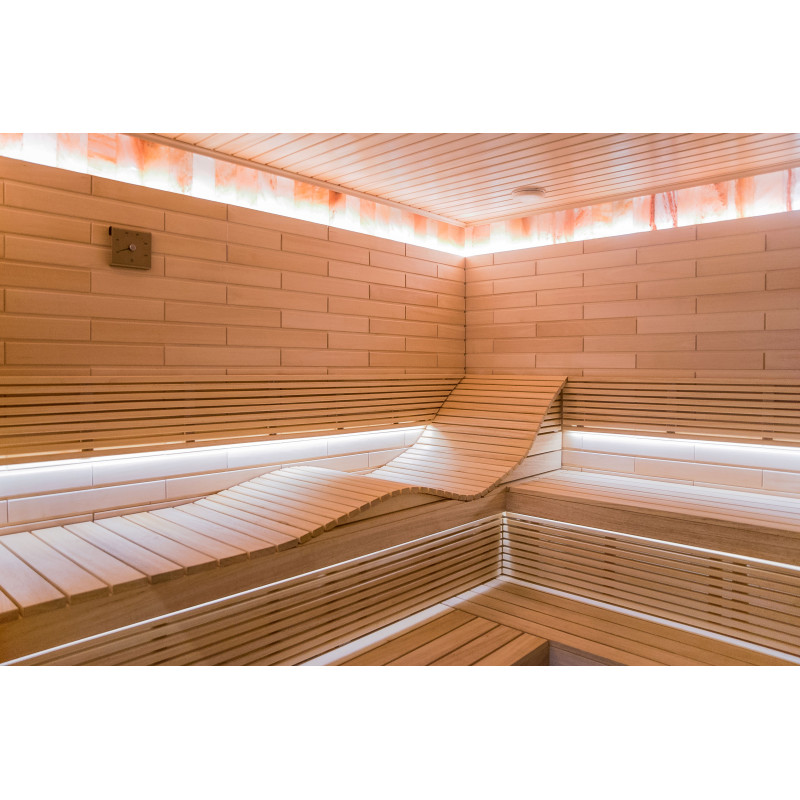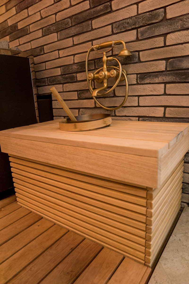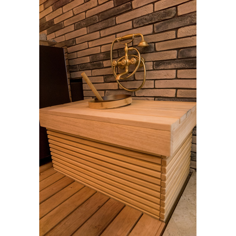 Interieurinrichting van de sauna - lindehout, bedplanken, vloerroosters - abachihout. Bedden, steunen en wanden zijn geïmpregneerd met olie en gelakt.
