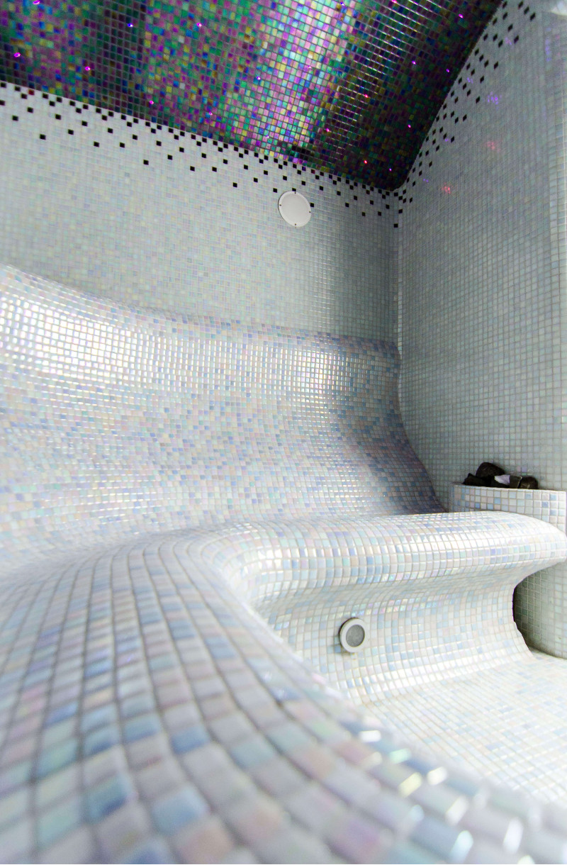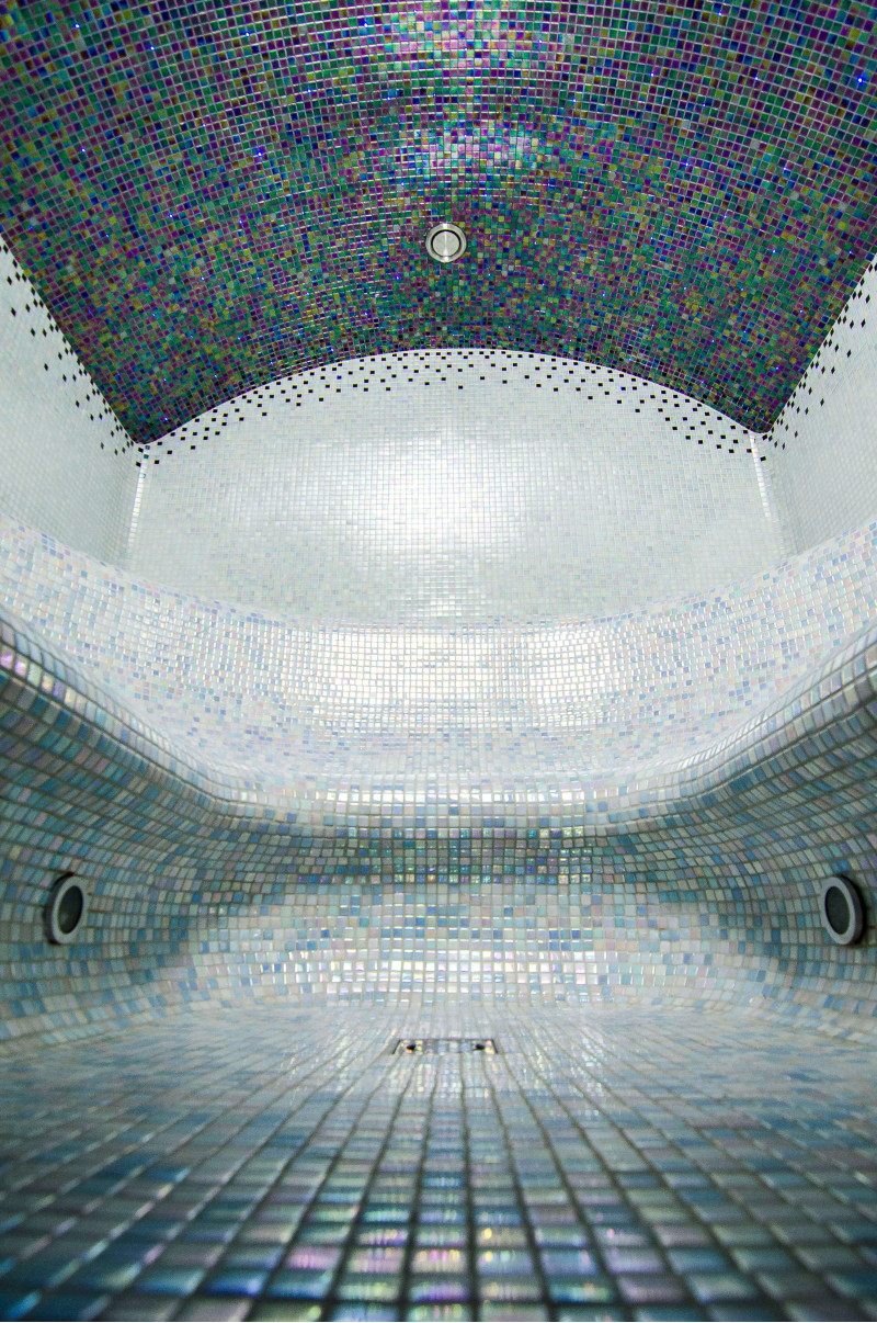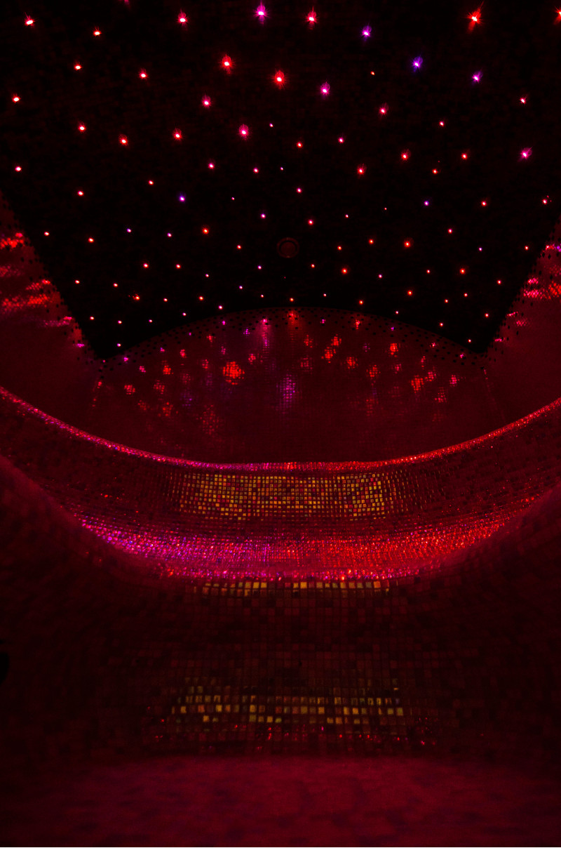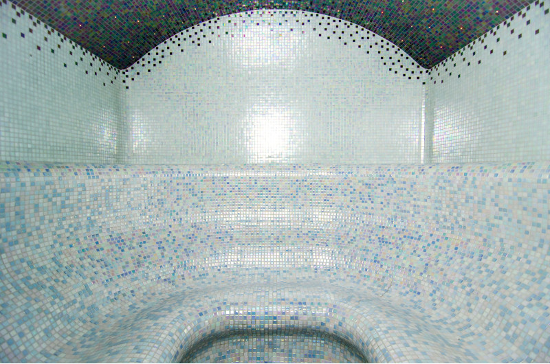 De banken, vloeren en muren zijn versierd met pastelkleurige mozaïektegels. Het plafond is bedekt met gekleurde tegels, die samen met de plafondverlichting een nog indrukwekkender uitzicht geven.