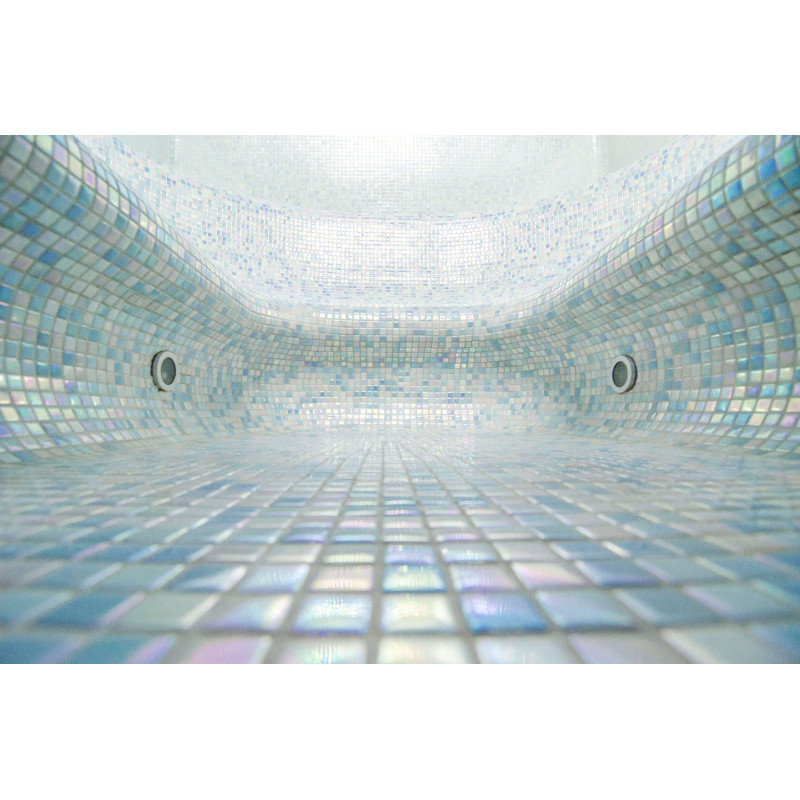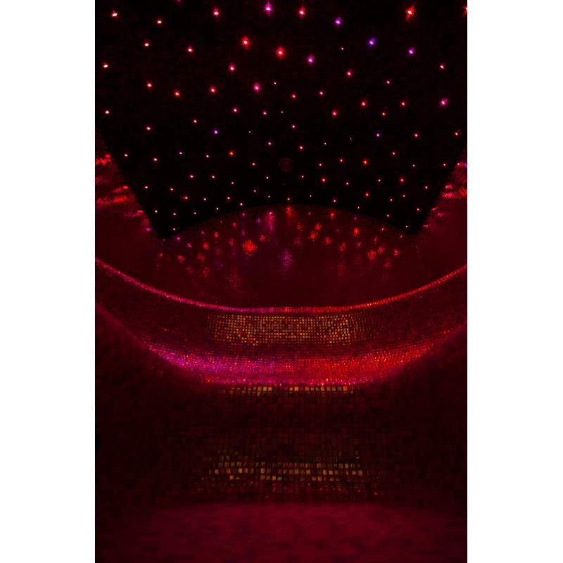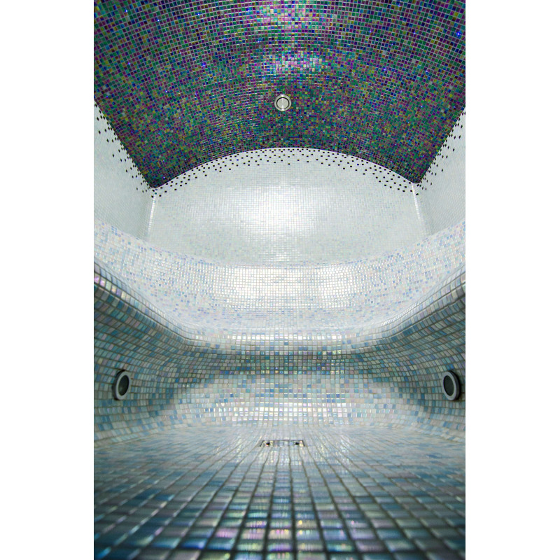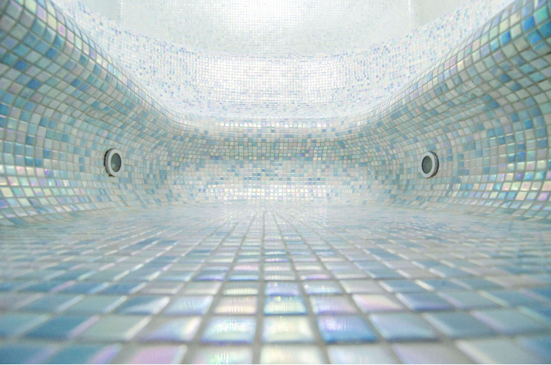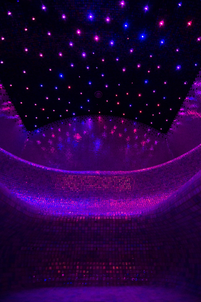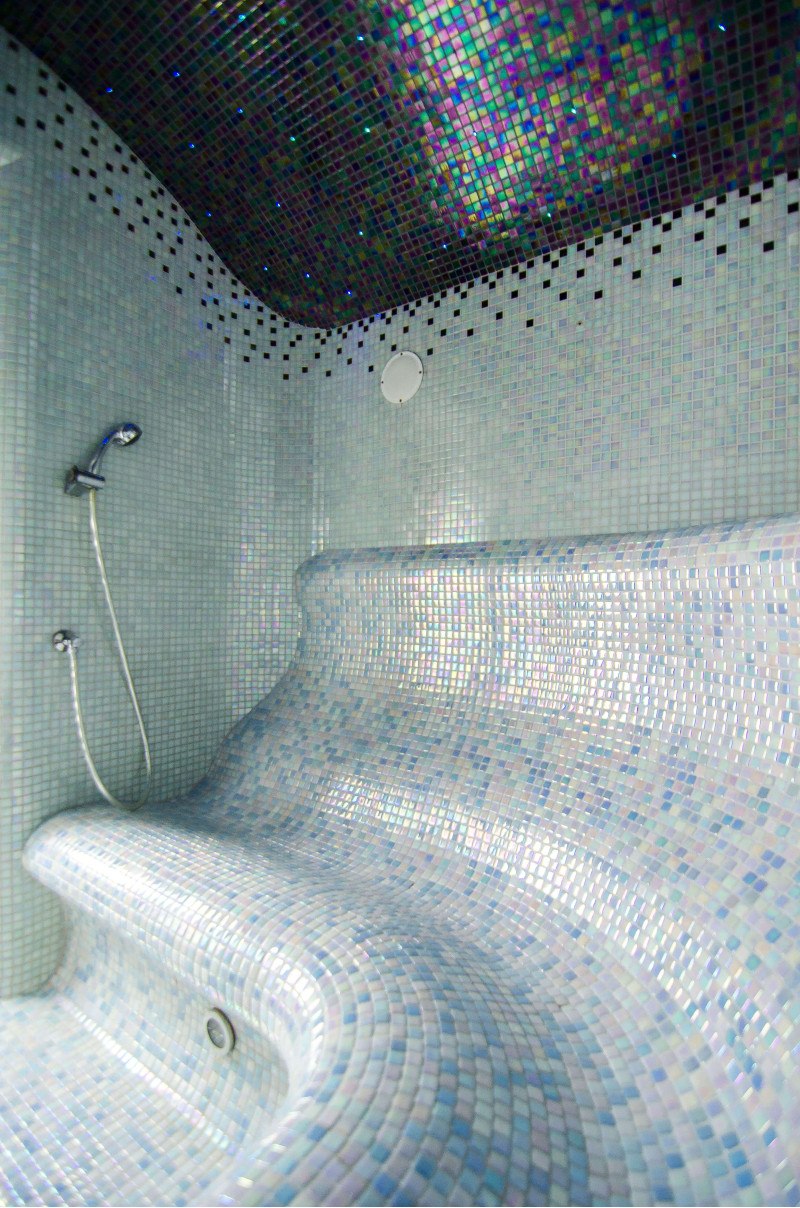 De banken, vloeren en muren zijn versierd met pastelkleurige mozaïektegels. Het plafond is bedekt met gekleurde tegels, die samen met de plafondverlichting een nog indrukwekkender uitzicht geven.