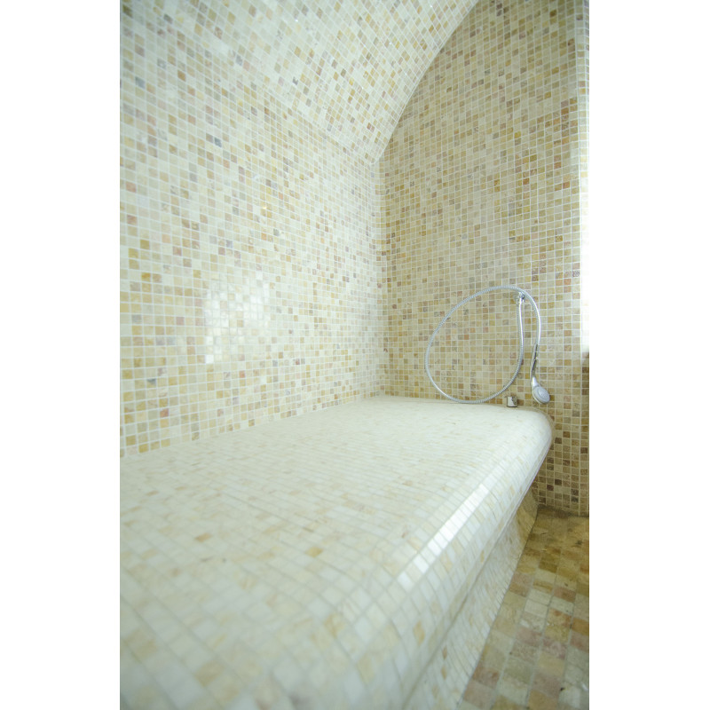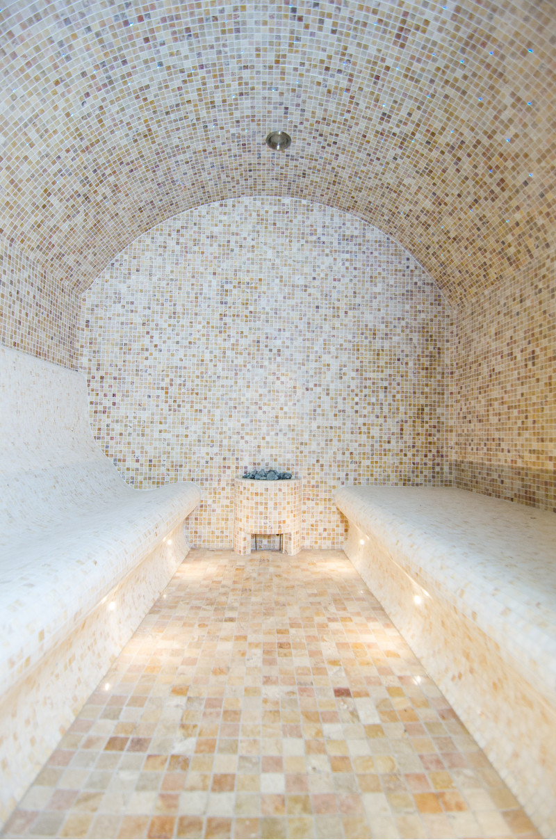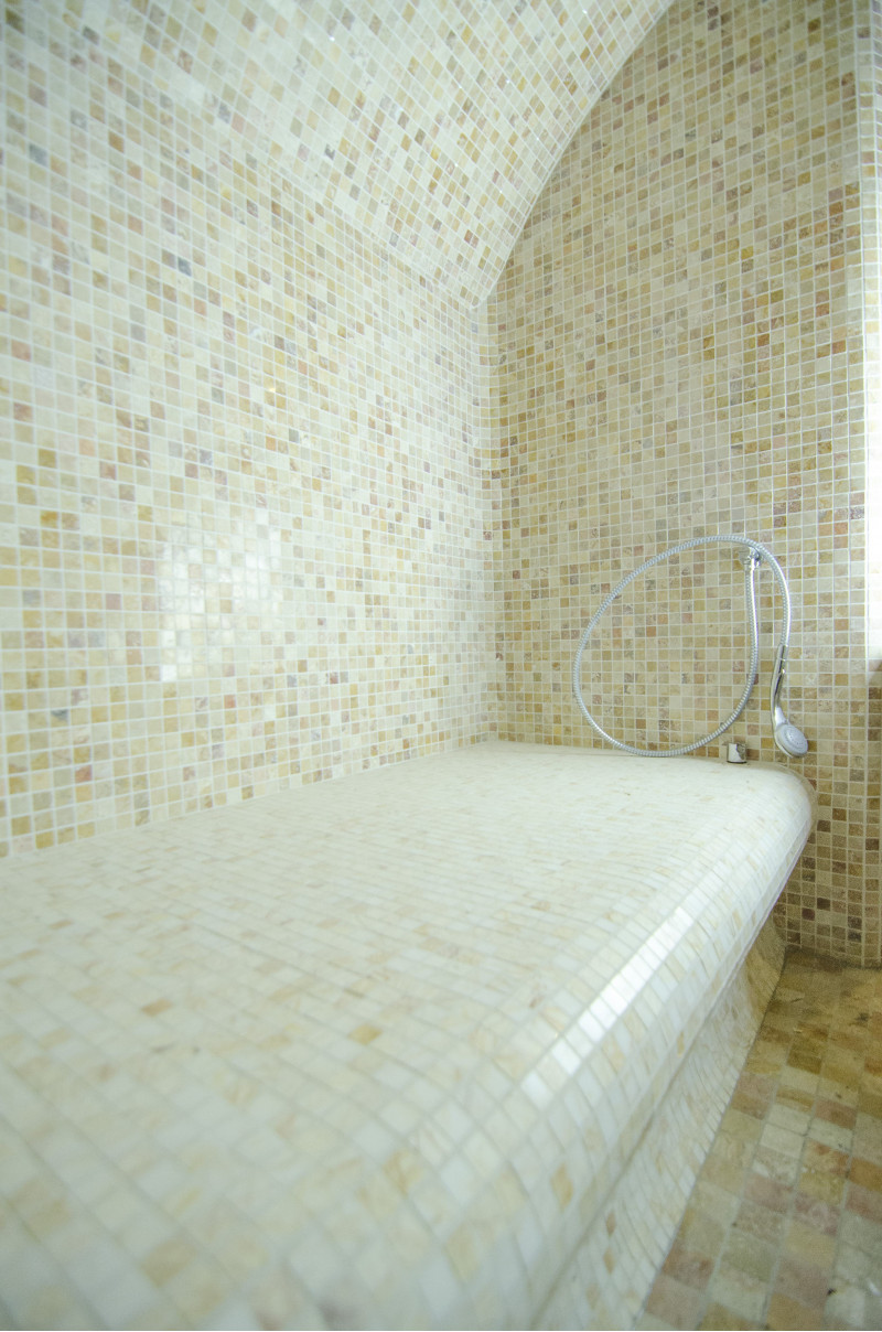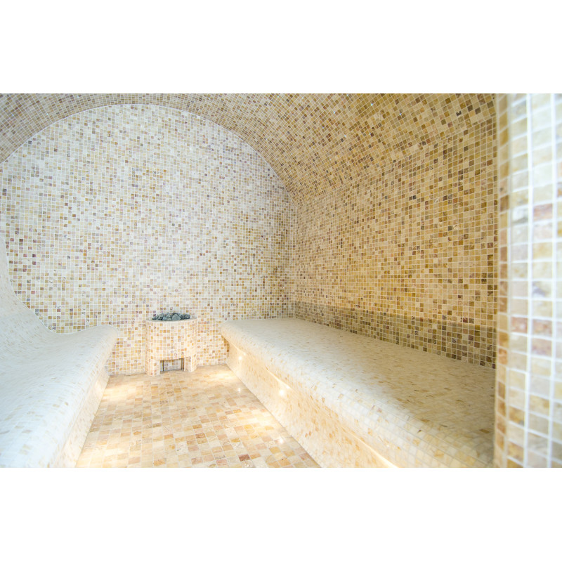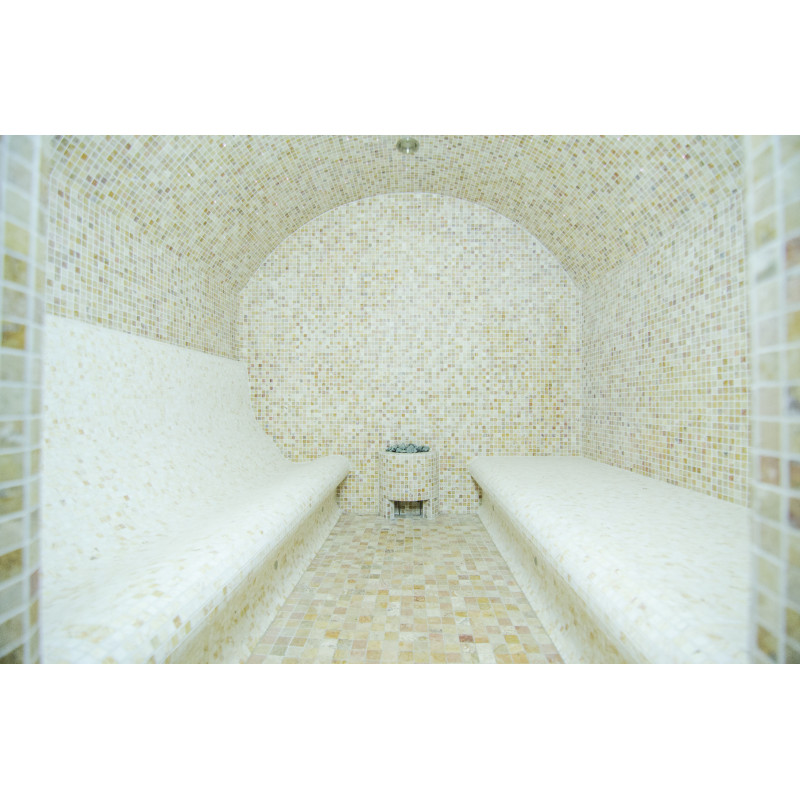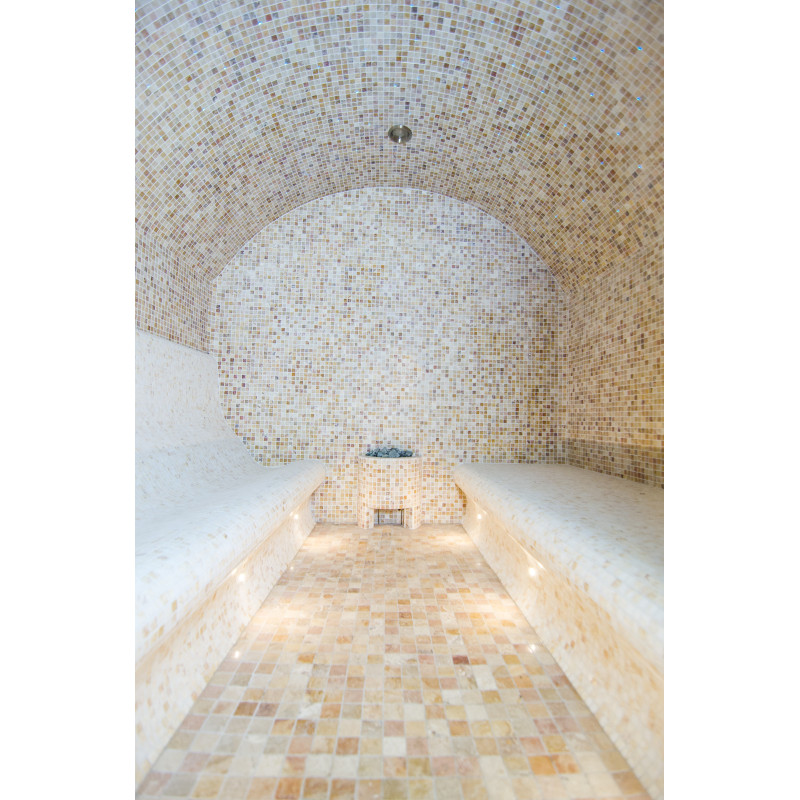 Afwerking - de gehele saunaruimte en banken zijn versierd met mozaïektegels.