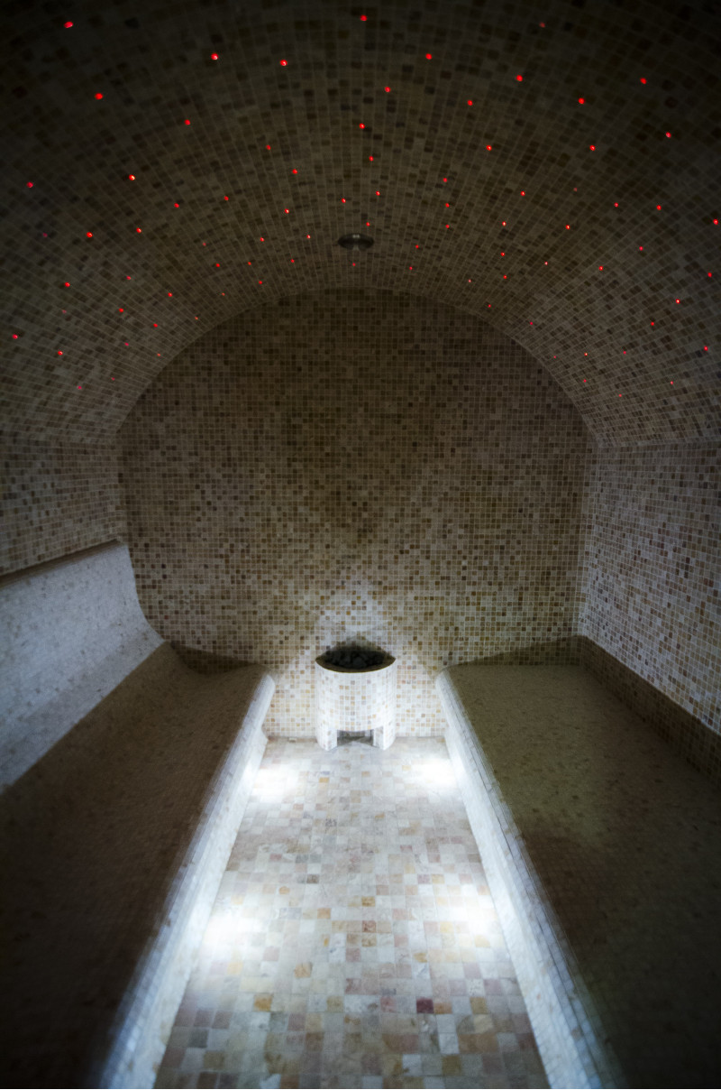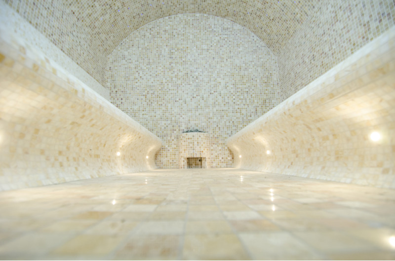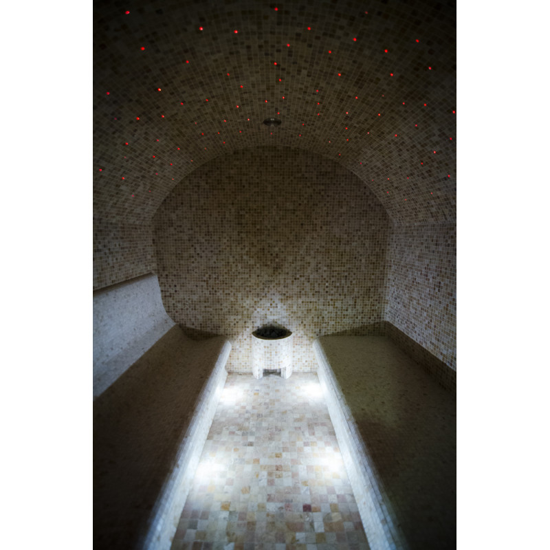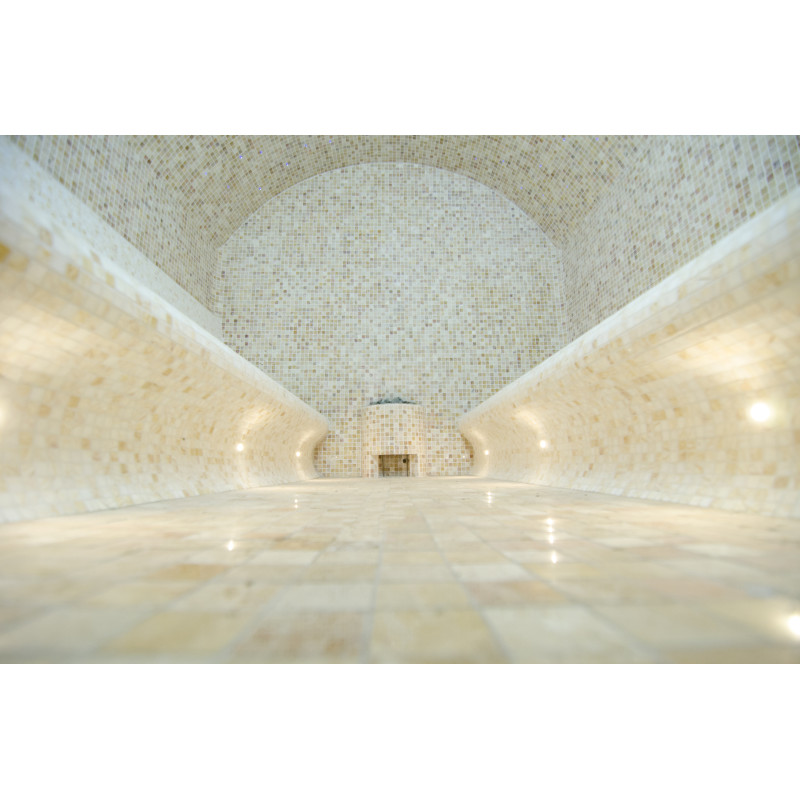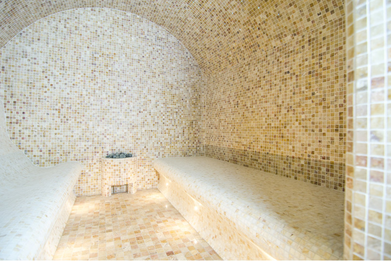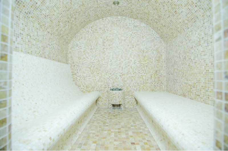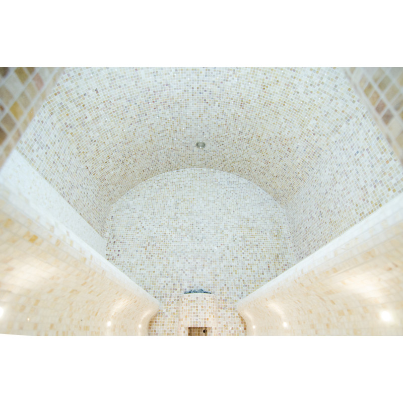 Afwerking - de gehele saunaruimte en banken zijn versierd met mozaïektegels.
