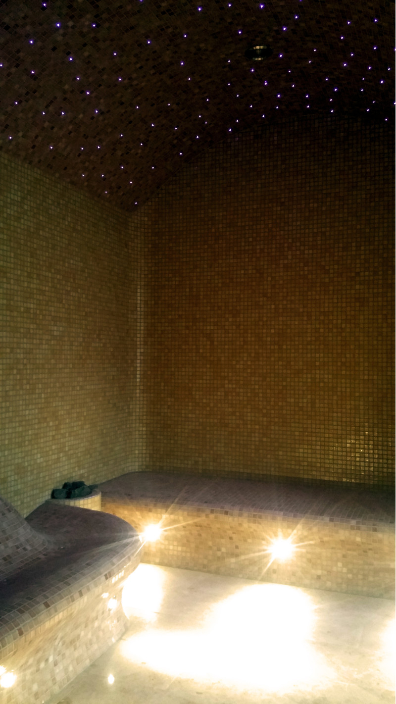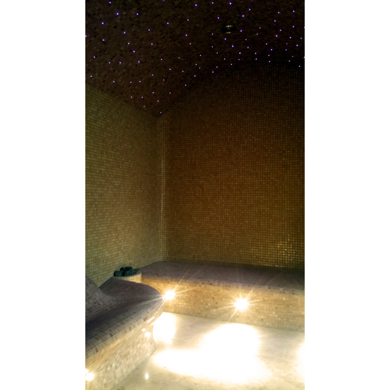 Glasvezelverlichtingssysteem voor het plafond - "sterrenhemel". Onder de banken is led-verlichting aangebracht om de vloer te verlichten.