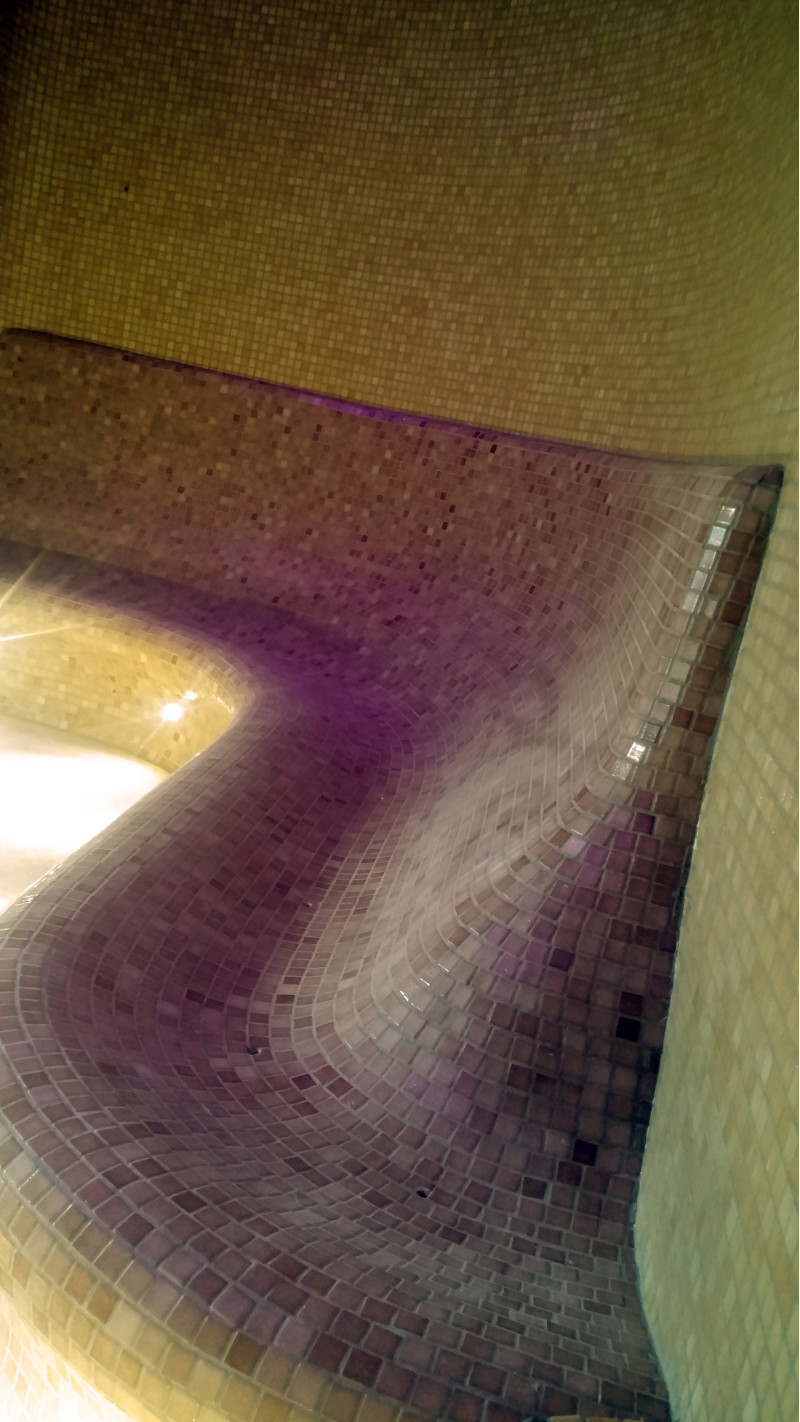 Afwerking - vloeren, muren, banken versierd met gebroken glasmozaïektegels.