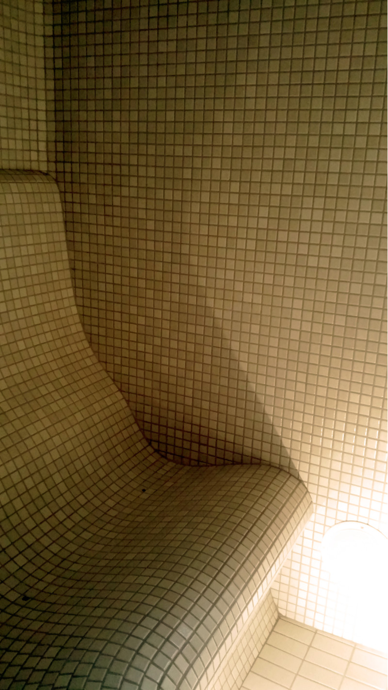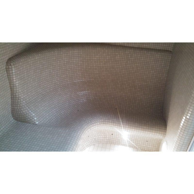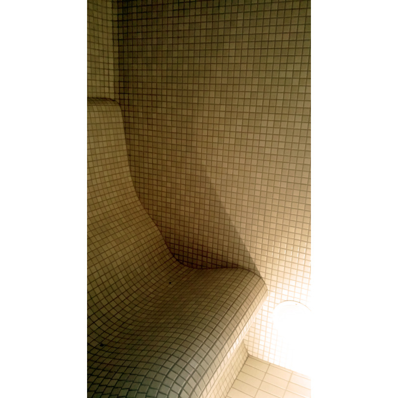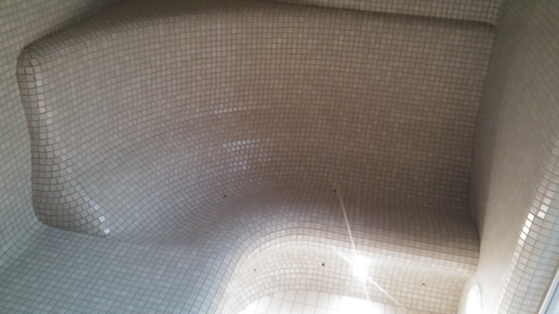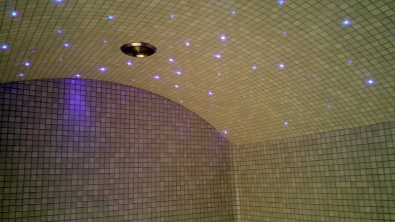 Afwerking - saunaplafonds, muren en zonnebanken zijn gedecoreerd met gebroken glasmozaïektegels. De vloer is een tegel met een lange levensduur.