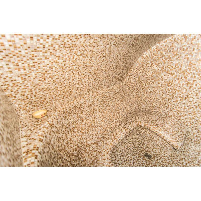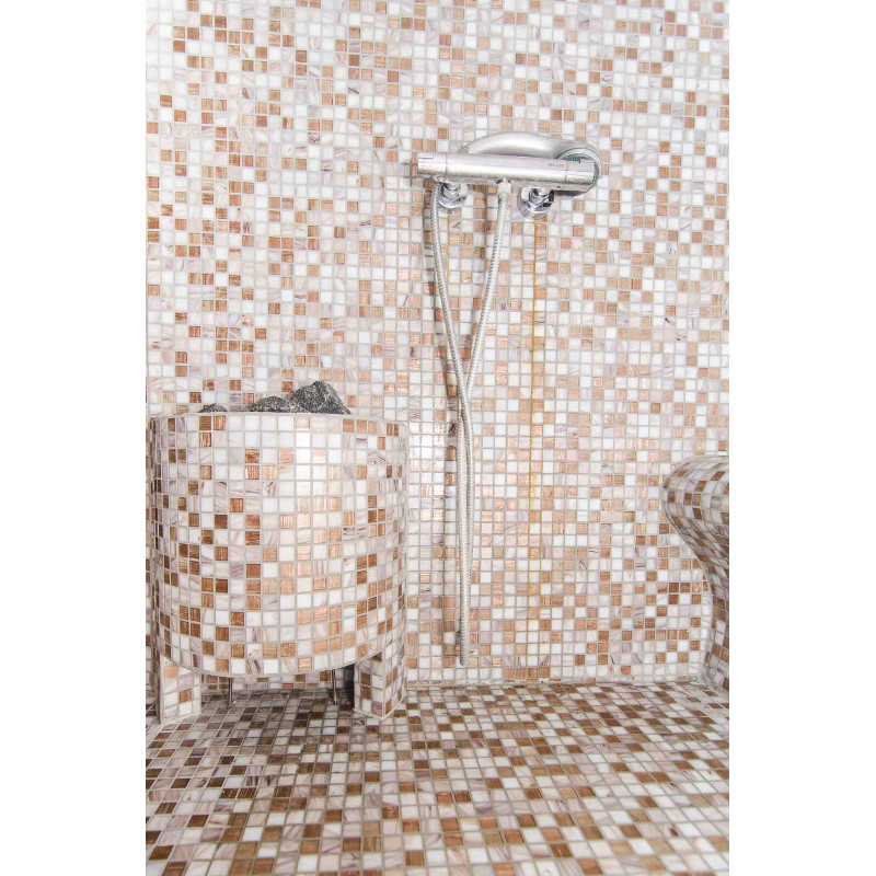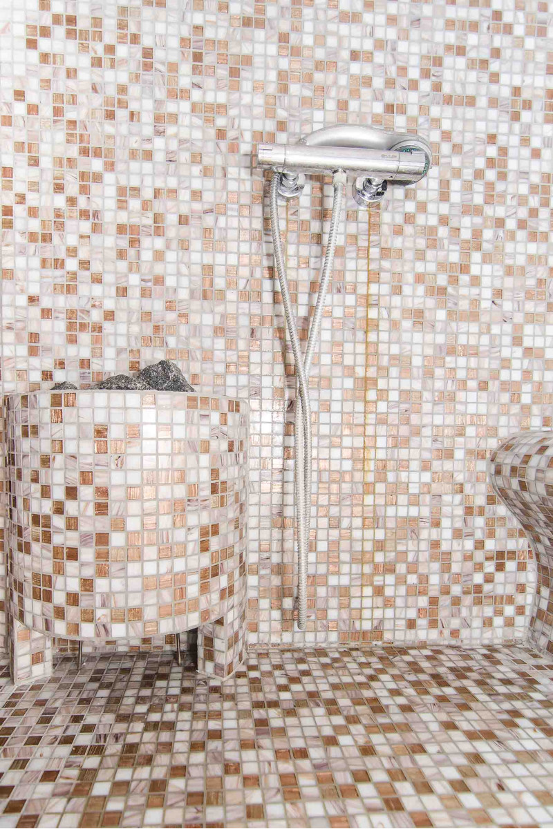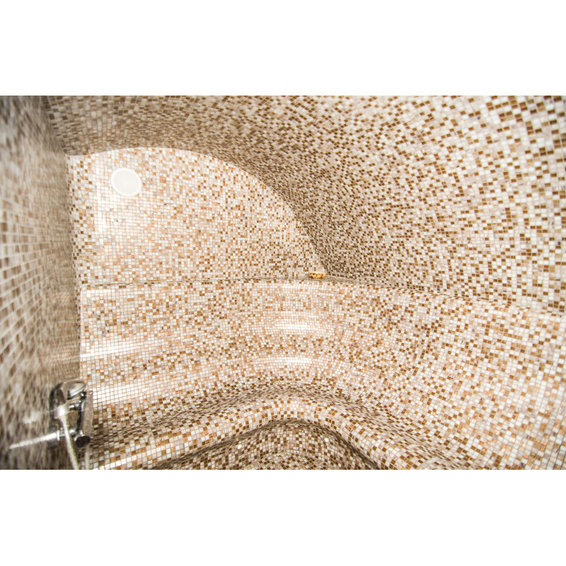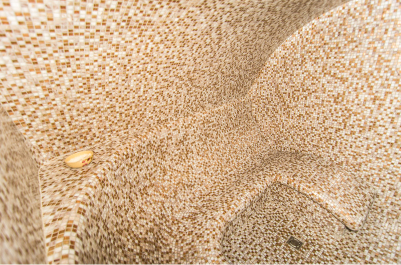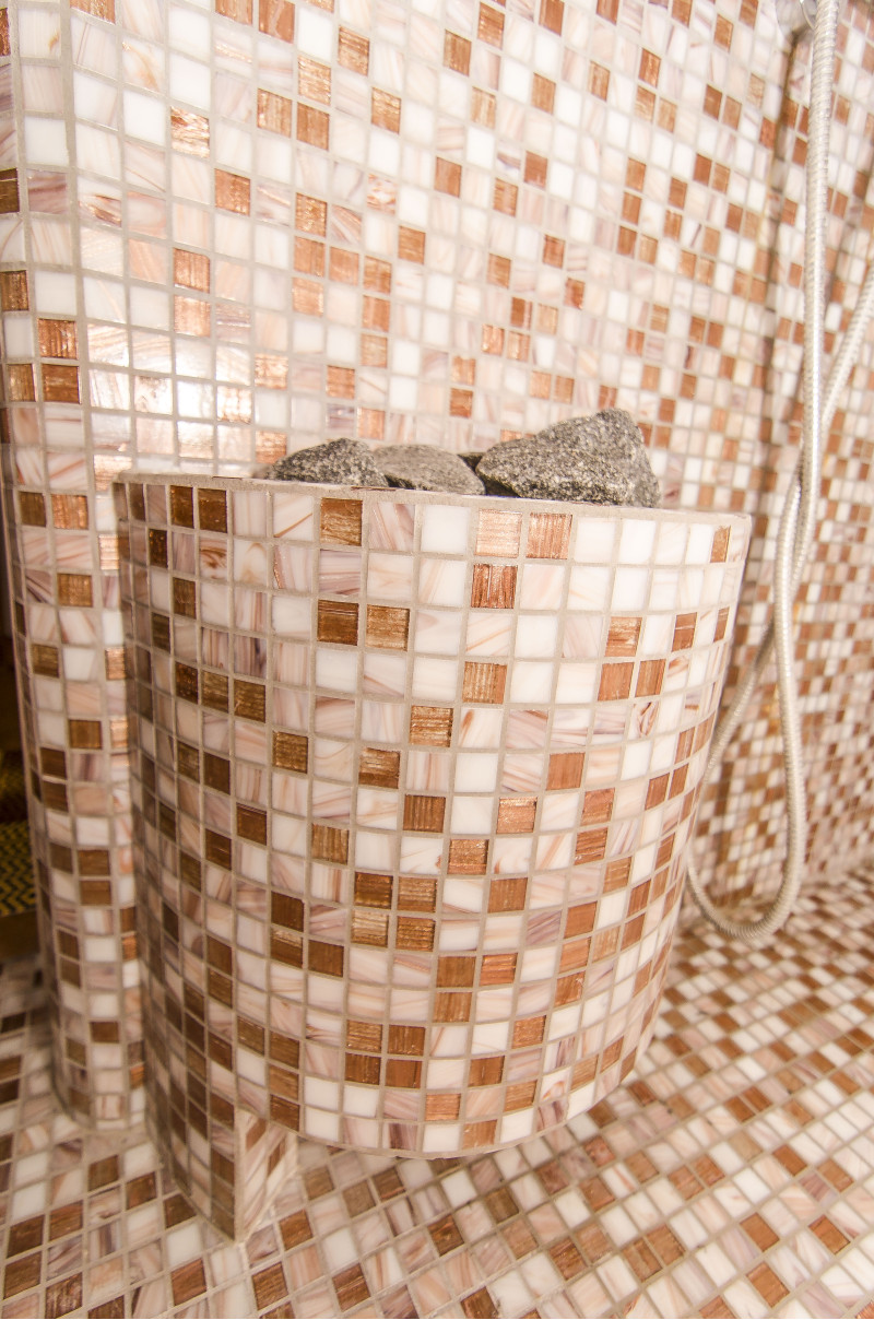 Afwerking - neutraal gekleurde gebroken glasmozaïektegels.